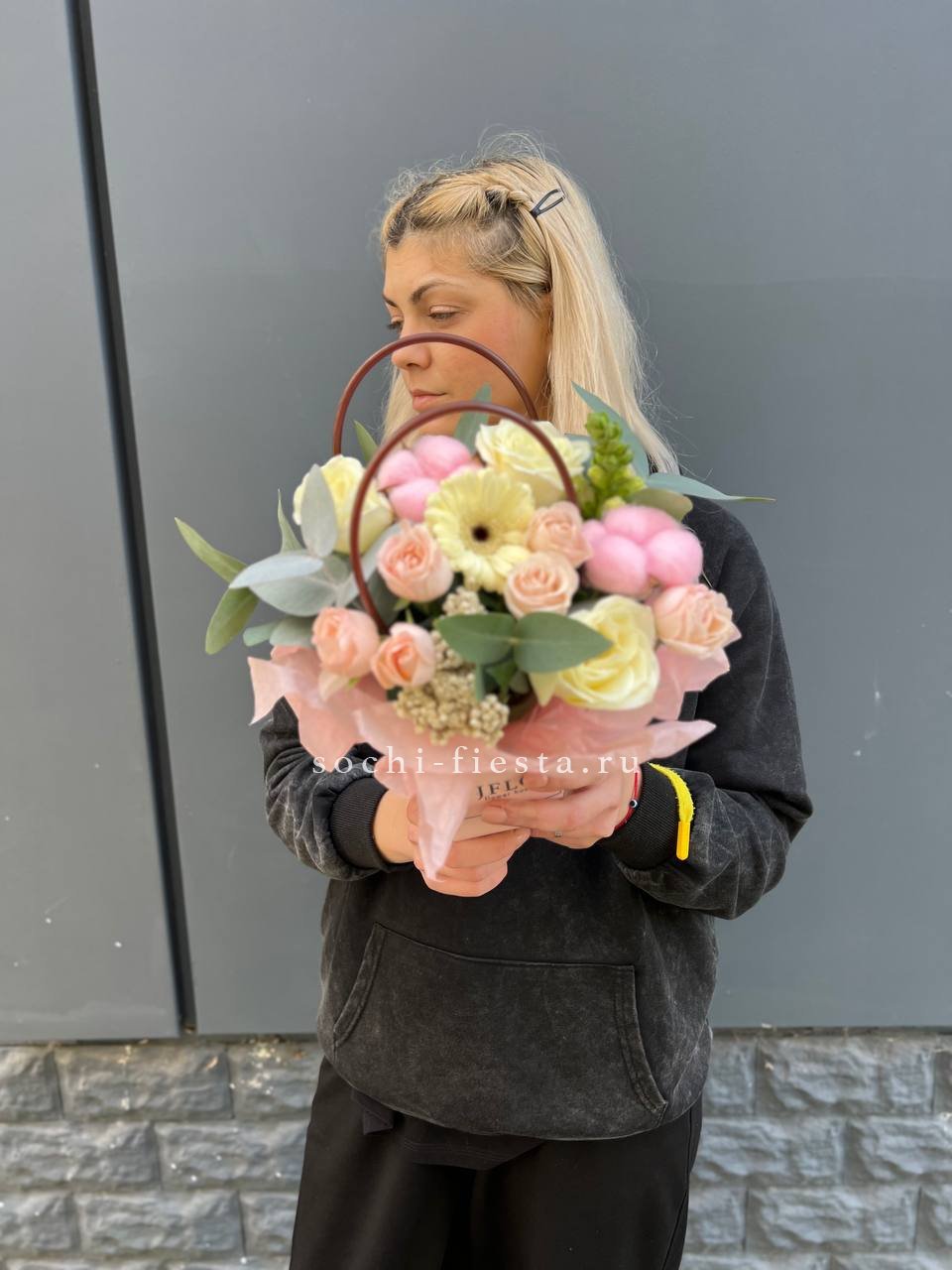 Эустома и бомбастик с хлопком размещены так что композиция выглядит легко и не занимает много места. Такая сумочка удобна для подарка в руки и долго сохраняет свежесть.