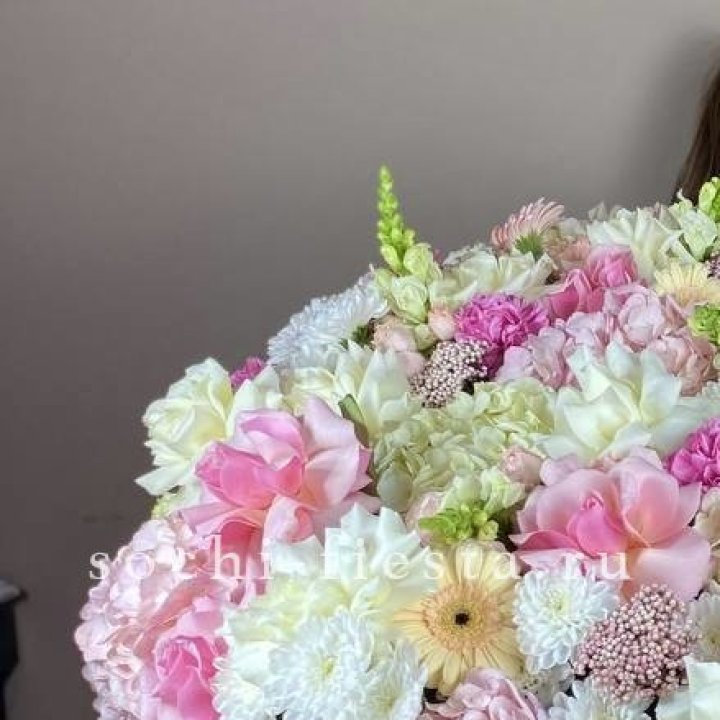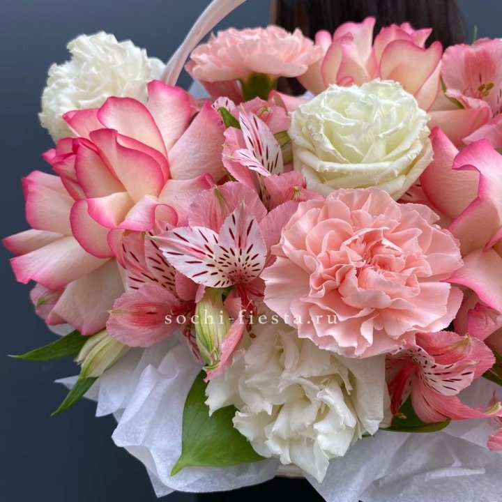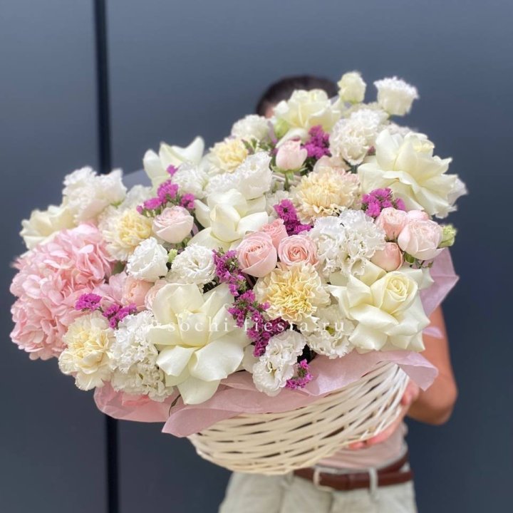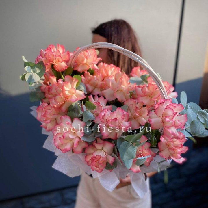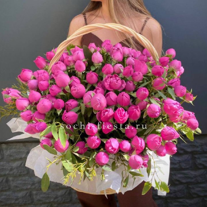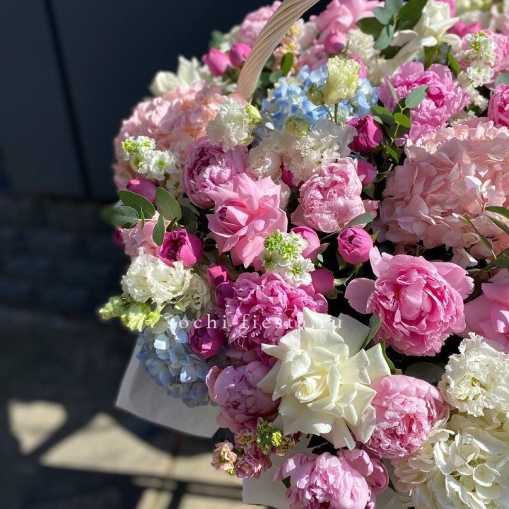 Состав корзин в Кирове определяется текущими поставками и сезоном. Розы Freedom, Mondial, Cappuccino — для классических куполообразных аранжировок. Пионы в мае-июне из свежих поставок: Sarah Bernhardt, Red Charm, Bowl of Cream — главный сезонный продукт. Хризантема, альстромерия, гербера — для объёмных торжественных наполнений. Эустома, ранункули — для садовых корзин. Флорист строит состав под конкретный запрос.