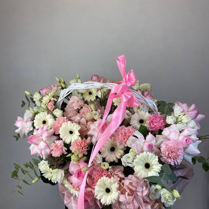 Садовая корзина — главный тренд последних лет. Свободная многовидовая аранжировка в плетёной корзине: эустома, ранункули, нигелла, зелень — ощущение только что срезанных цветов из загородного сада. Покупают те, кто устал от строгих классических форматов и ищет природной органики и лёгкости в подарке.