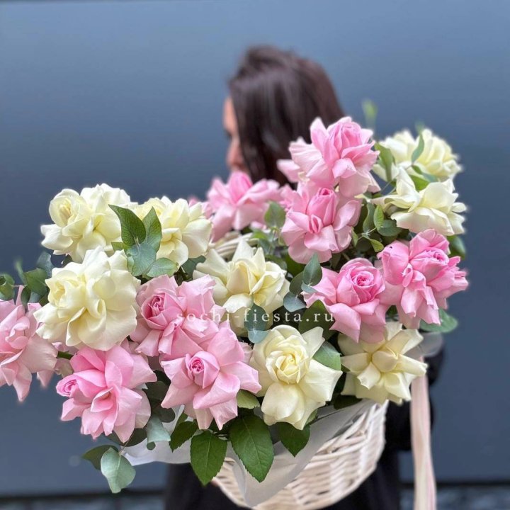 Именинная корзина в Кирове — самый популярный частный формат. Флорист создаёт куполообразную аранжировку в плетёной корзине диаметром 35-55 см. Розы или пионы в основе, зелень и декоративные акценты — нарядный объект, который сразу создаёт торжественную атмосферу. Именно такую корзину несут на юбилей или важный день рождения, когда хотят, чтобы подарок был виден и запомнился.