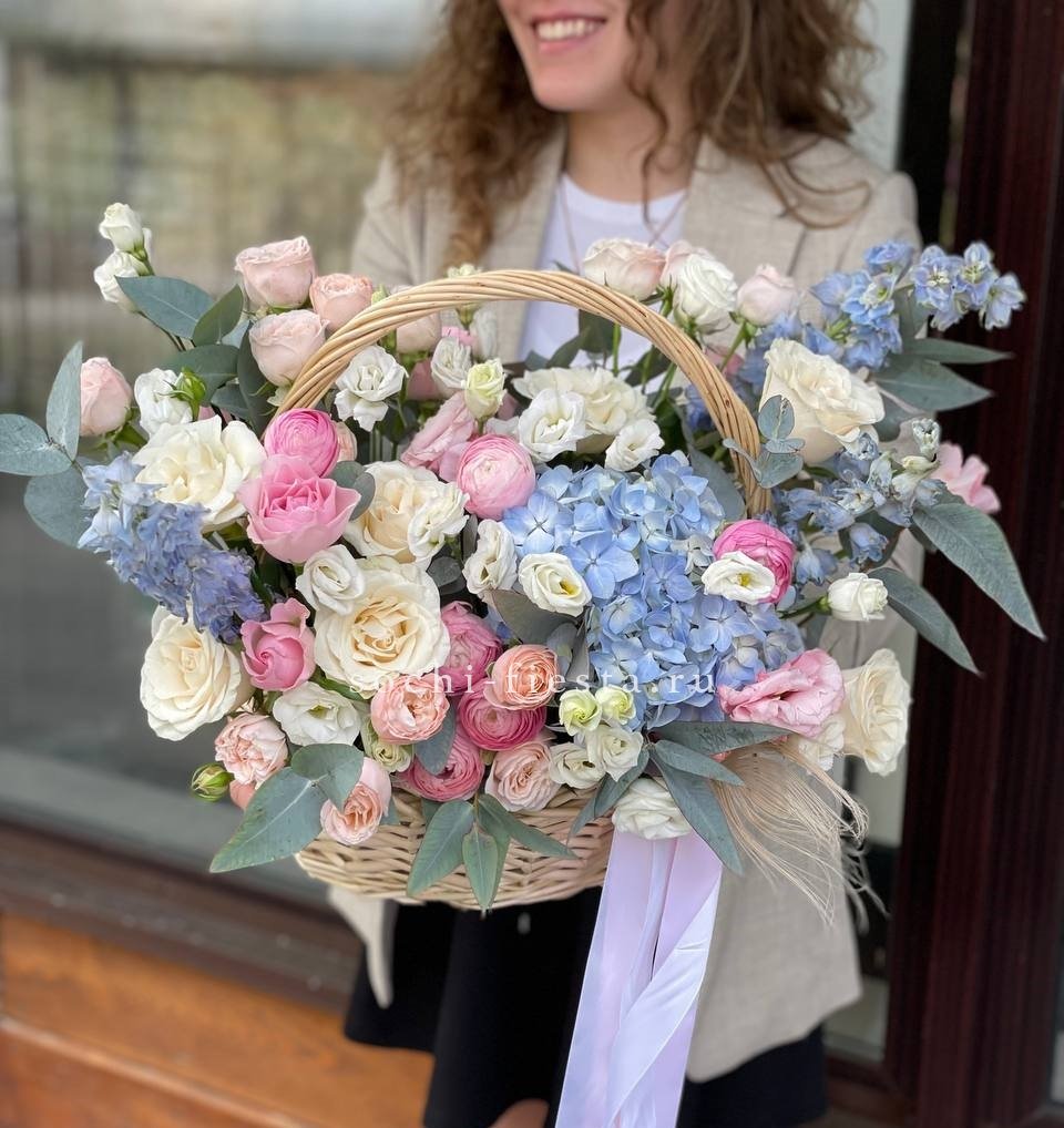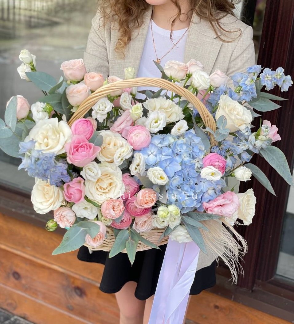 гортензии, розы одноголовые, диантусы, кустоые розы, альстромерии, эвкалипт, корзина.