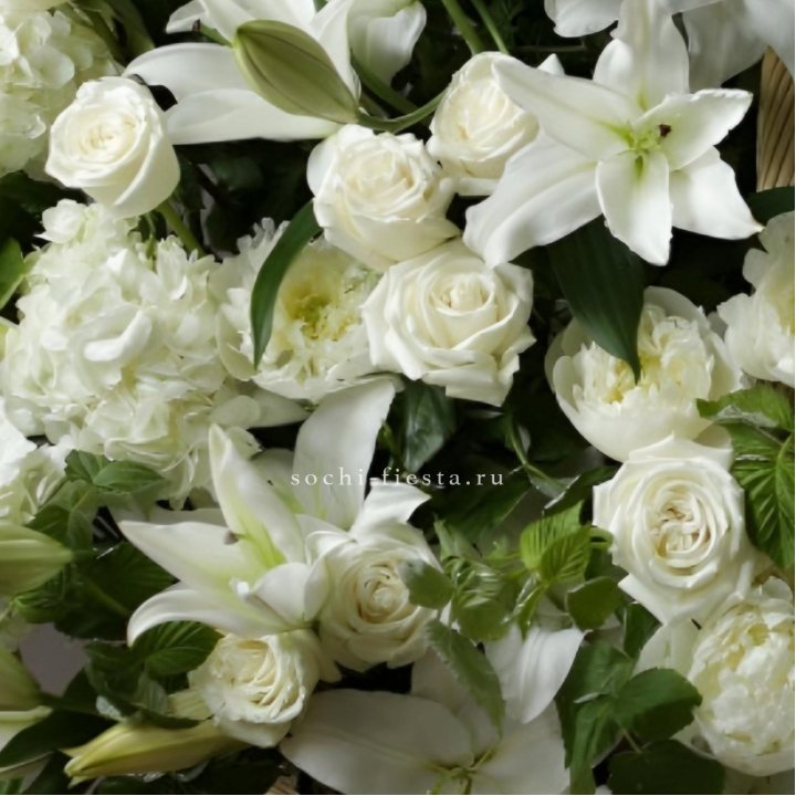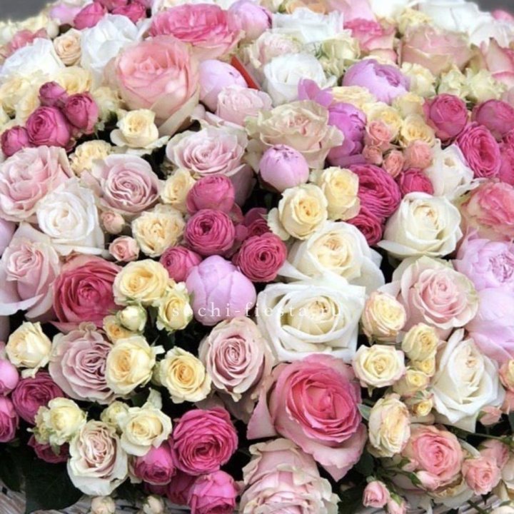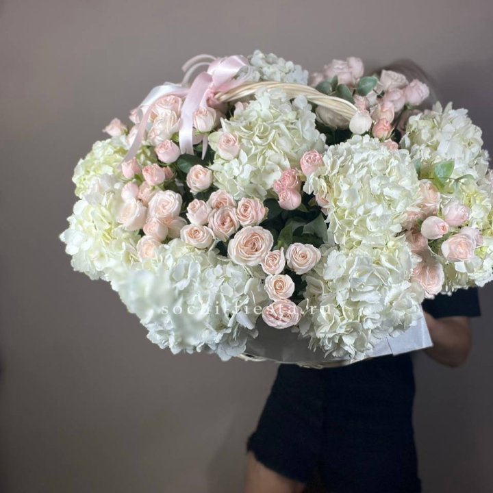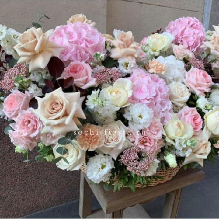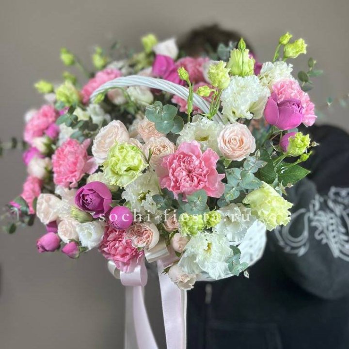 Состав корзин в Кирове определяется текущими поставками и сезоном. Розы Freedom, Mondial, Cappuccino — для классических куполообразных аранжировок. Пионы в мае-июне из свежих поставок: Sarah Bernhardt, Red Charm, Bowl of Cream — главный сезонный продукт. Хризантема, альстромерия, гербера — для объёмных торжественных наполнений. Эустома, ранункули — для садовых корзин. Флорист строит состав под конкретный запрос.