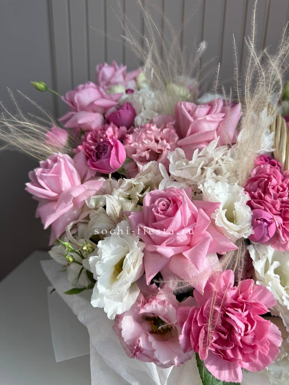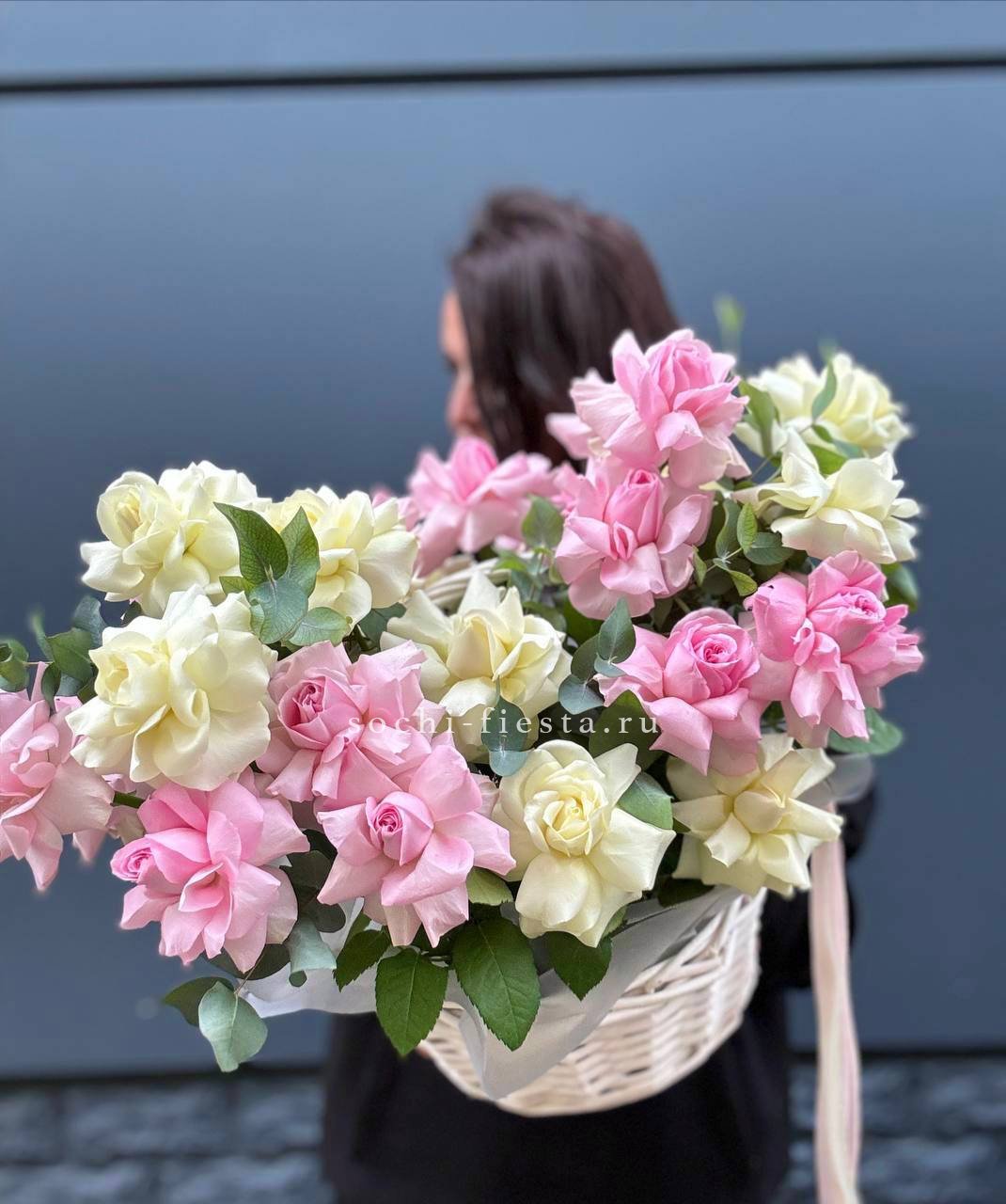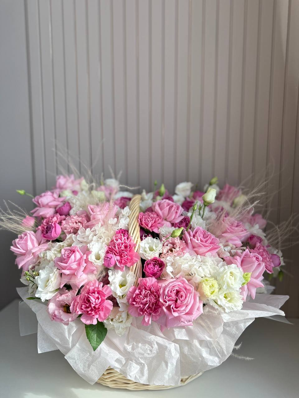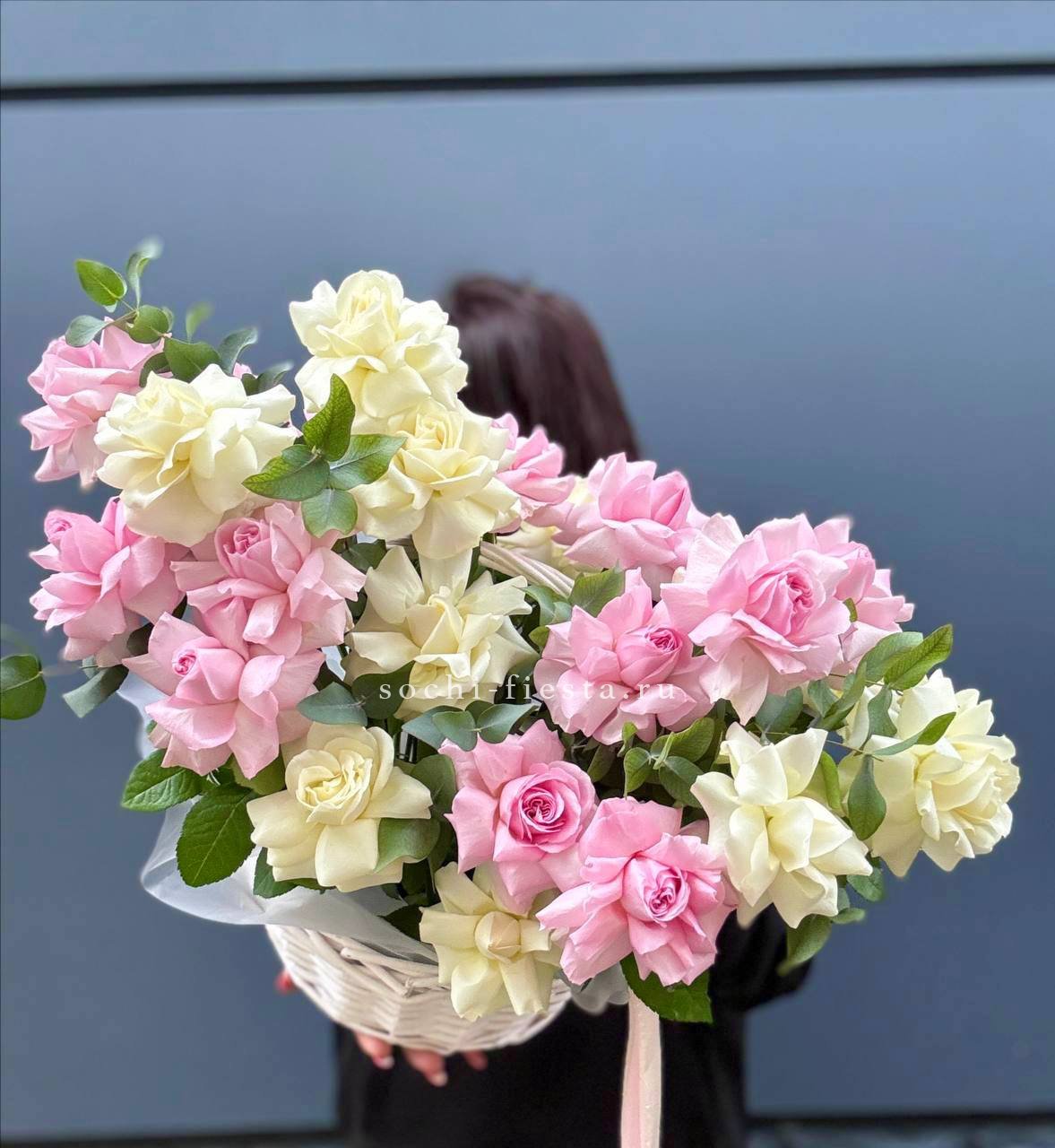 Пышная корзина с кустовыми розами и эустомой создает ощущение летнего изобилия. Диантусы добавляют воздушности между крупными бутонами, формируя объемную композицию. Готовое решение для яркого поздравления в удобной форме.
