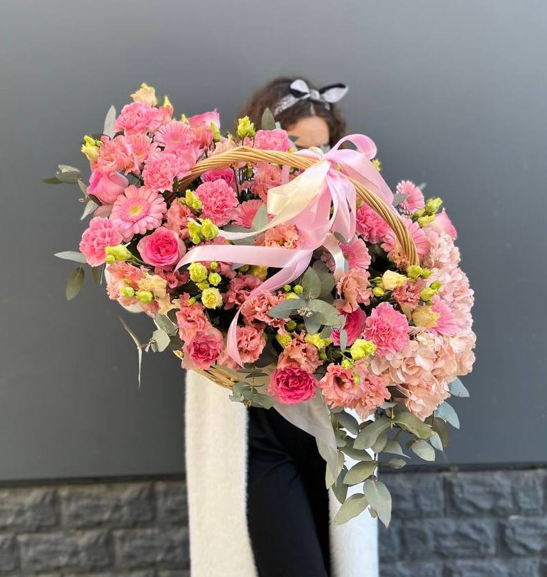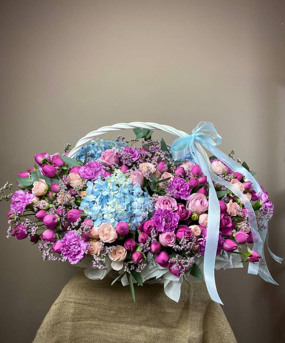 Корзина объединяет садовые розы с воздушной эустомой и яркими вспышками альстромерии. Ковыль добавляет лёгкости, а гортензия создаёт фактурный фон для всей композиции.