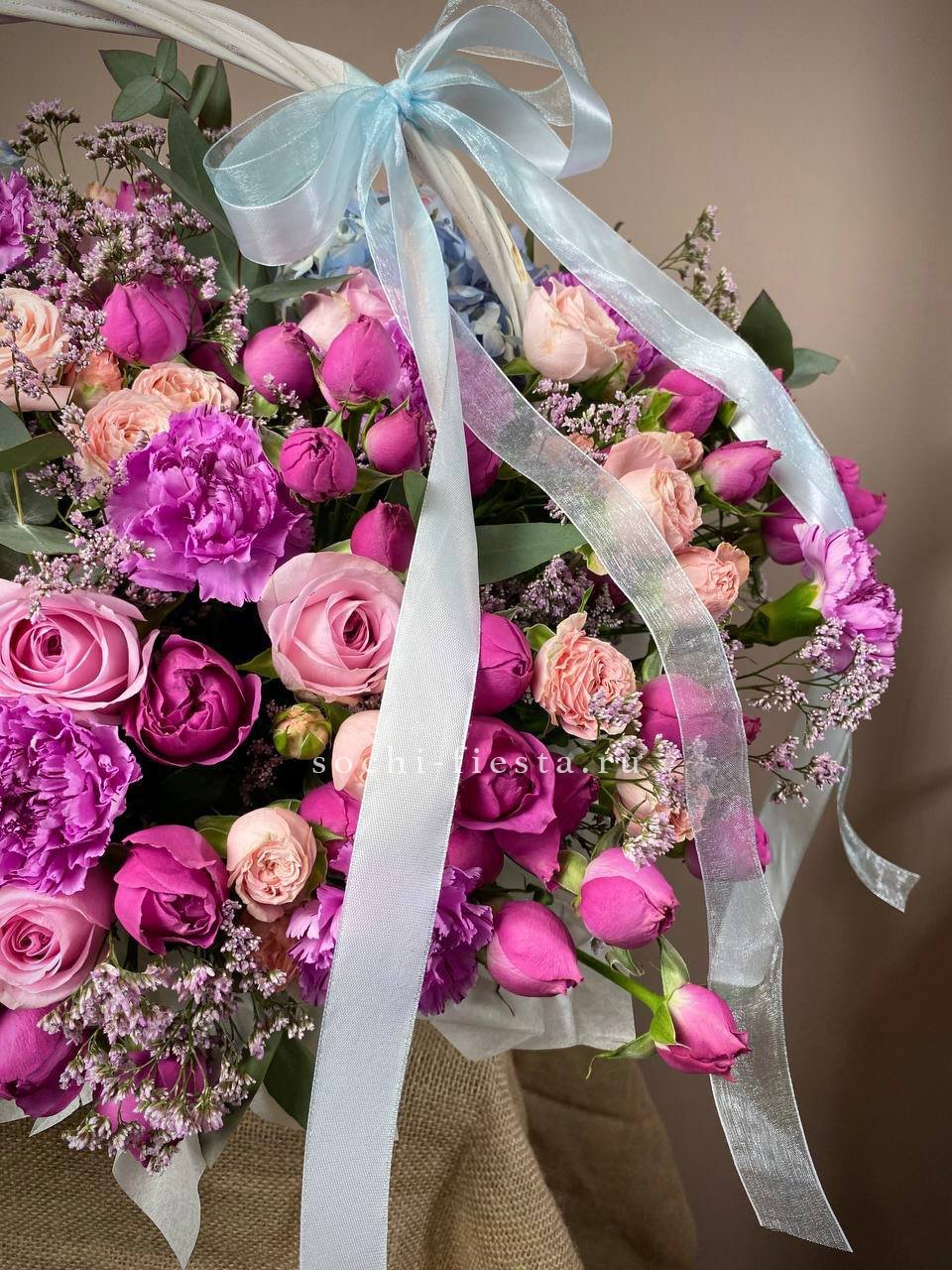 роза одноголовая, роза пионовидная, альстромерия, эустома, гортензия, ковыль, диантус, плетеная корзина.