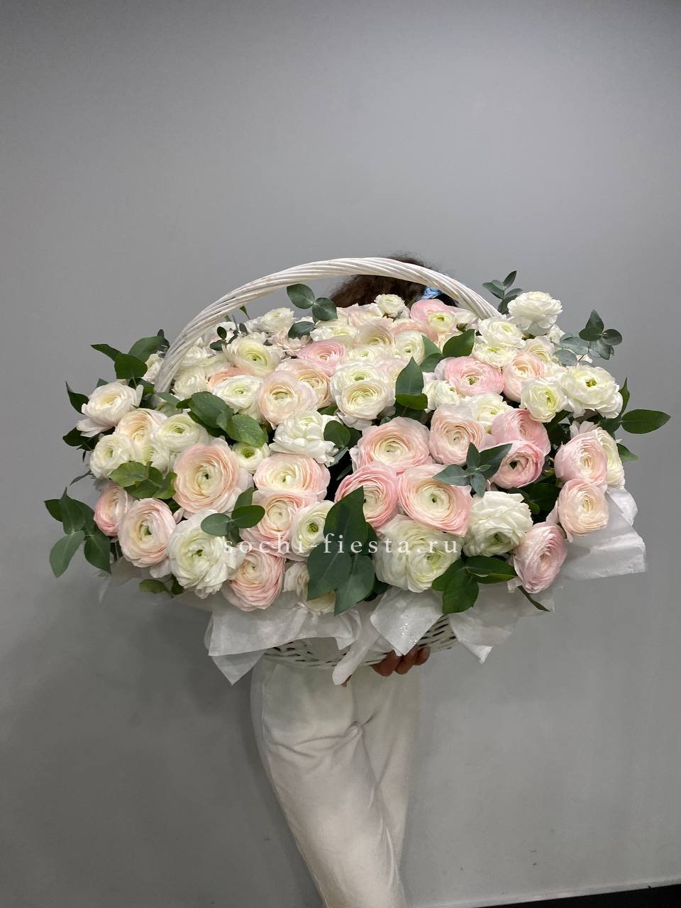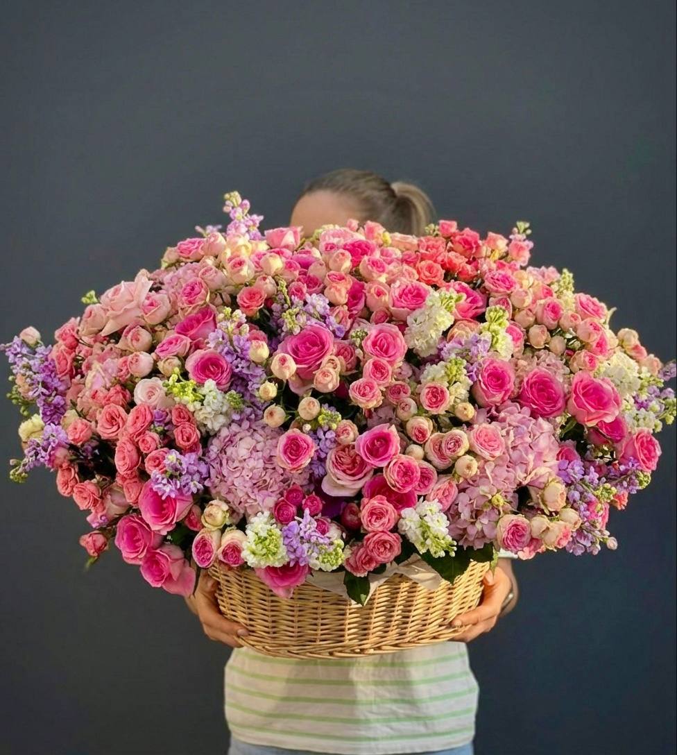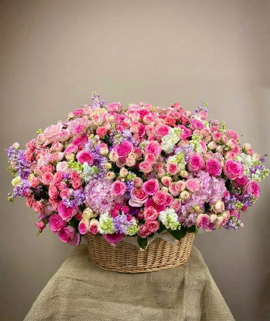 Двадцать пять французских роз в корзине создают плавный переход от светлых розовых тонов к насыщенной фуксии. Эвкалипт добавляет свежести и завершает композицию естественной зеленью. Букет удобно разместить на столе или комоде благодаря устойчивой корзине.