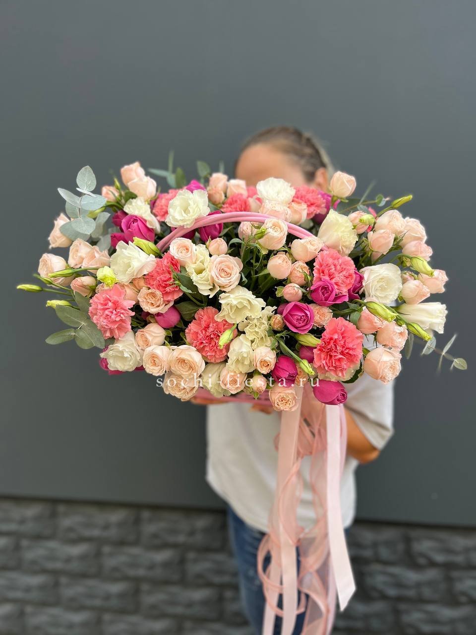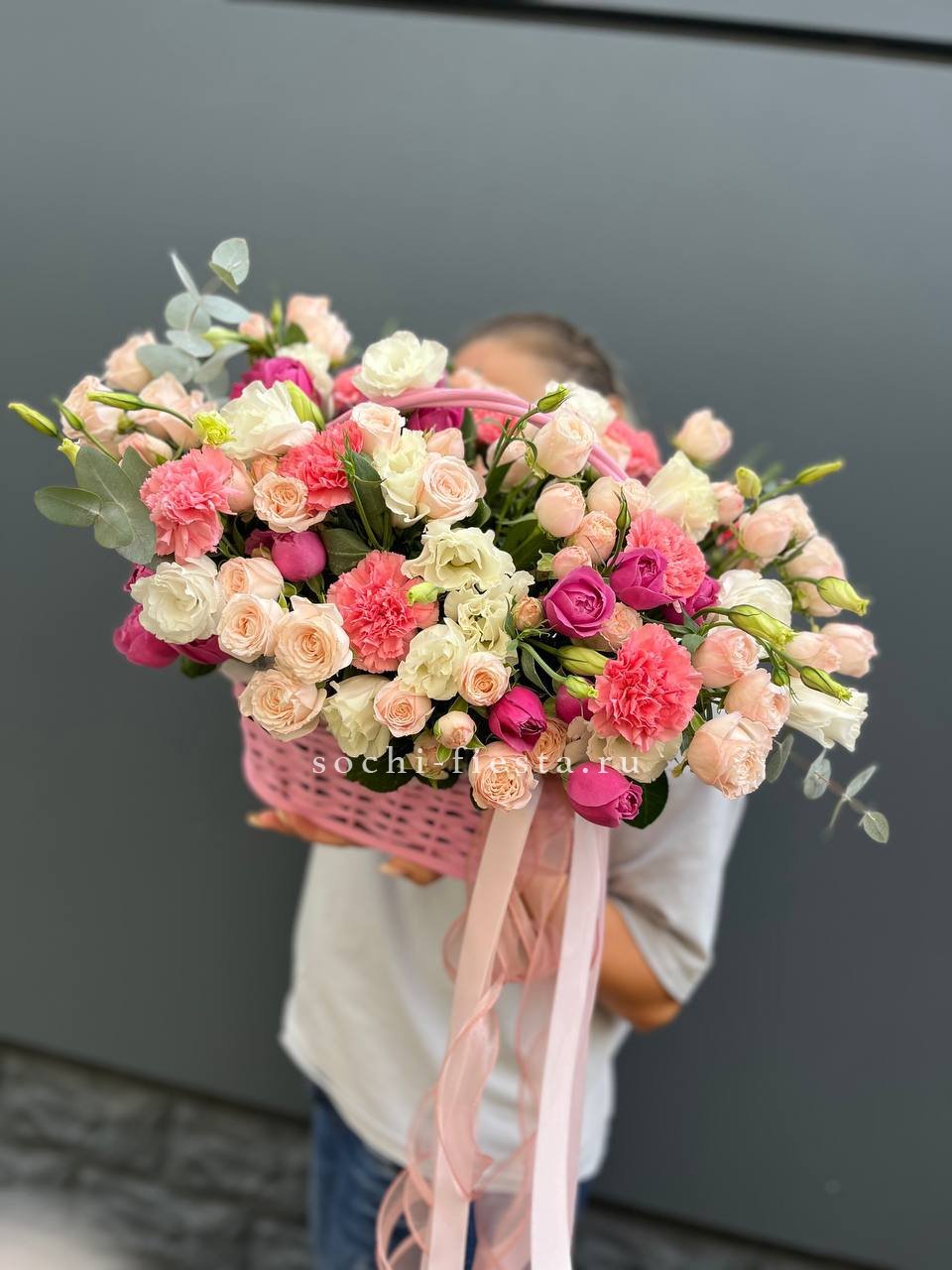 роза розовая (оттенки от нежно-розового до фуксии по наличию) французские - 25шт, эвкалипт, корзина.