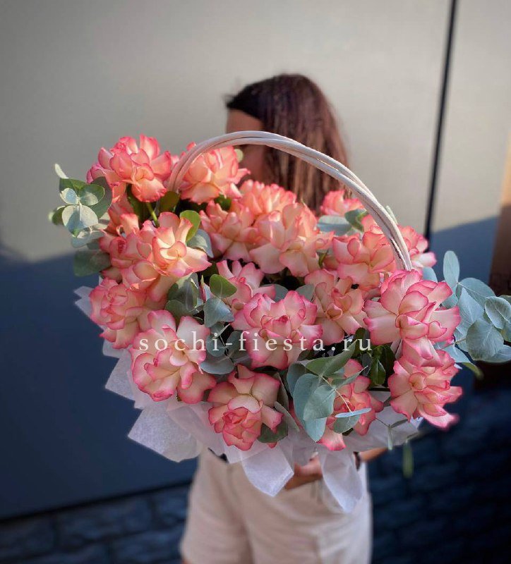 Диантусы создают воздушную текстуру, розы добавляют объем, а эустома раскрывается мягкими волнами. Композиция собрана в корзине и держит форму без лишних деталей.