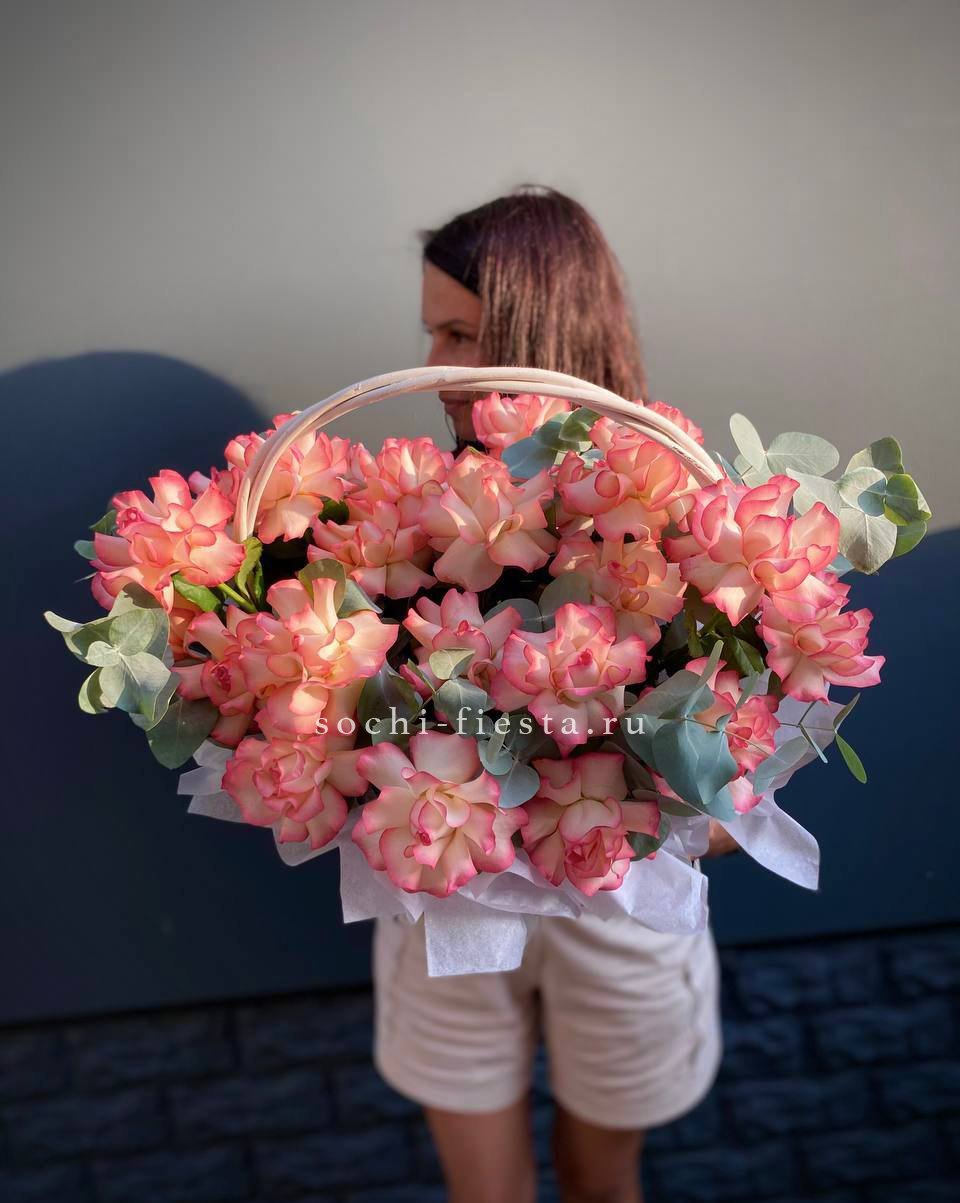 корзина из нежных цветов диантусов, роз, эустомы.