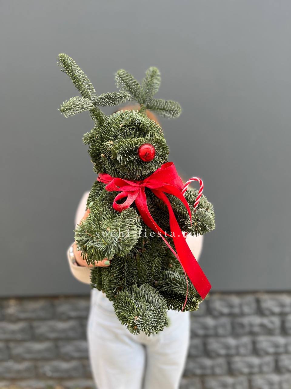 Фигура оленя полностью собрана из веток нобилиса. Объёмная скульптура с выразительным силуэтом заполняет пространство. Живая хвоя создаёт насыщенный зелёный фон для интерьера.