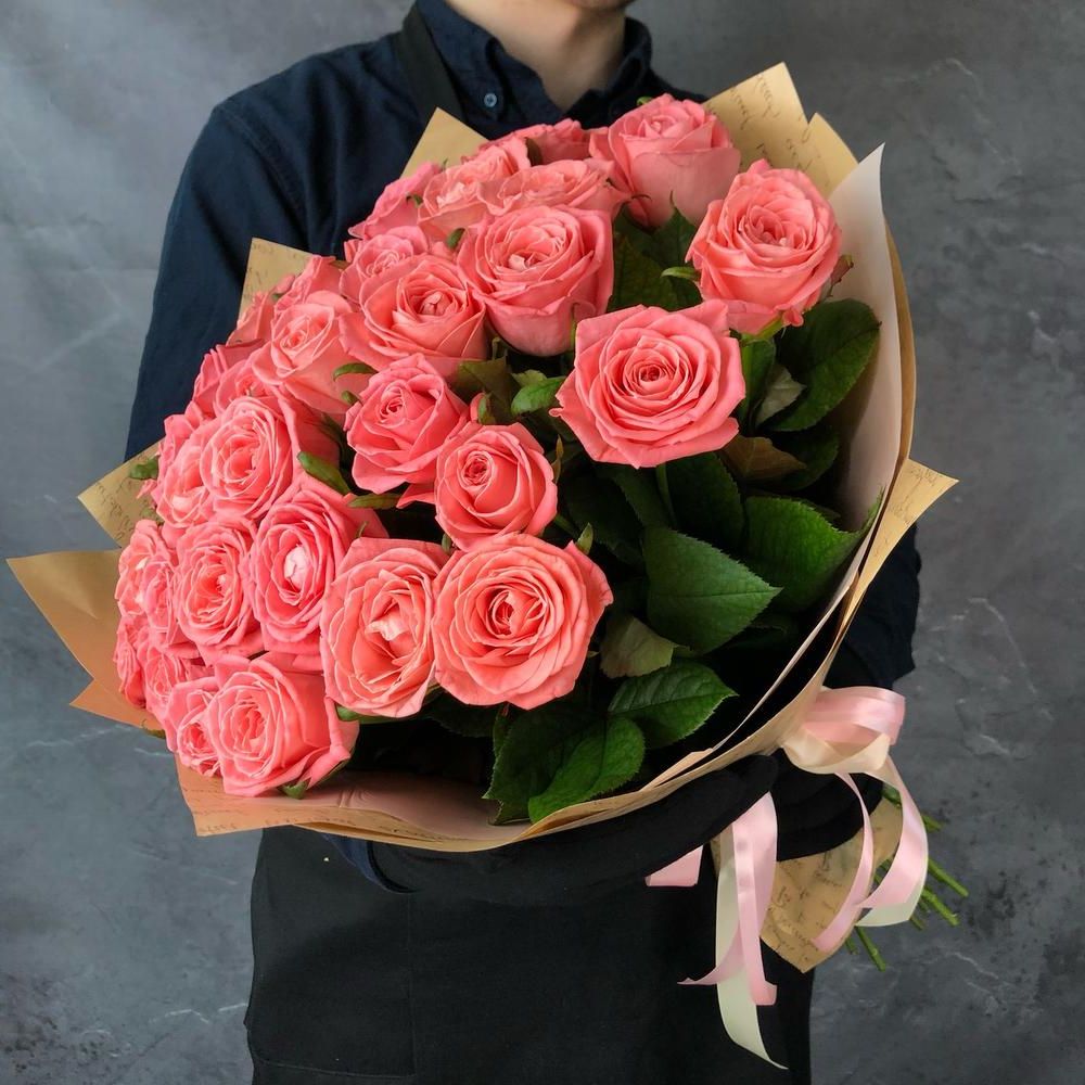 Состав букета на фотографии: 29 роз карина, крафт, лента