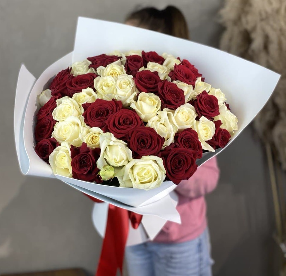 Красные и белые розы чередуются в крупной композиции, создавая живую игру света и тени между бутонами. Контрастная палитра подчеркивает свежесть каждого цветка и придает динамику всему букету.