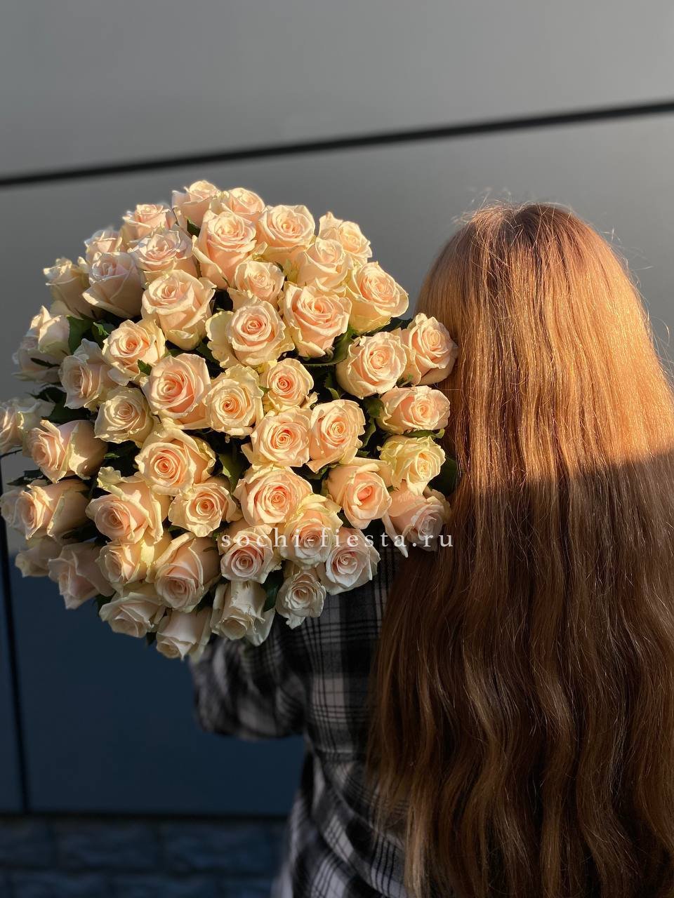Плотная охапка кремовых роз с мягким переходом оттенков от сливочного до топленого молока. Бутоны собраны без зазоров, образуя округлую форму с естественным объемом. Атласная лента фиксирует стебли и завершает композицию.
