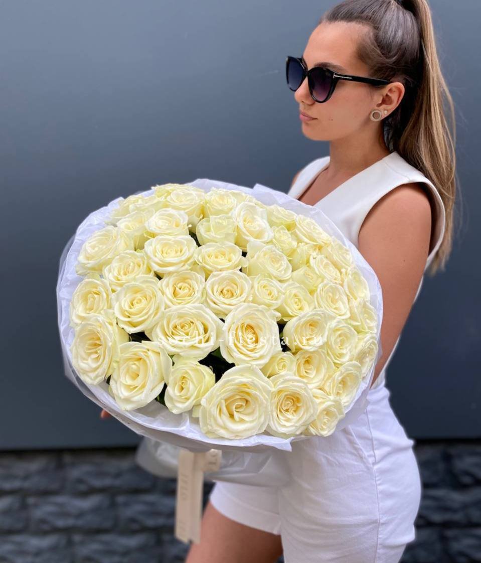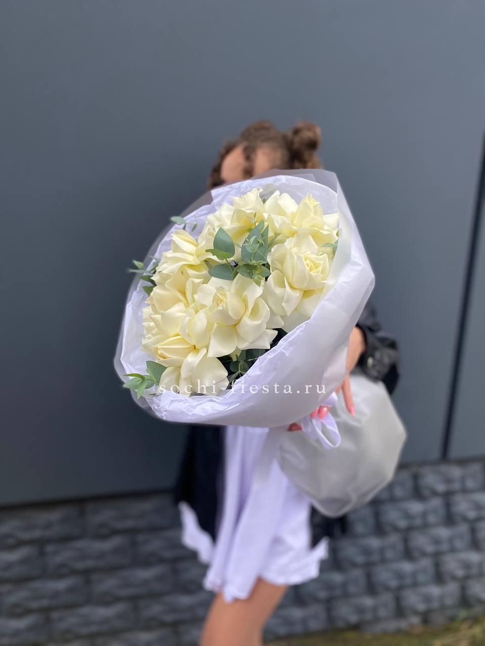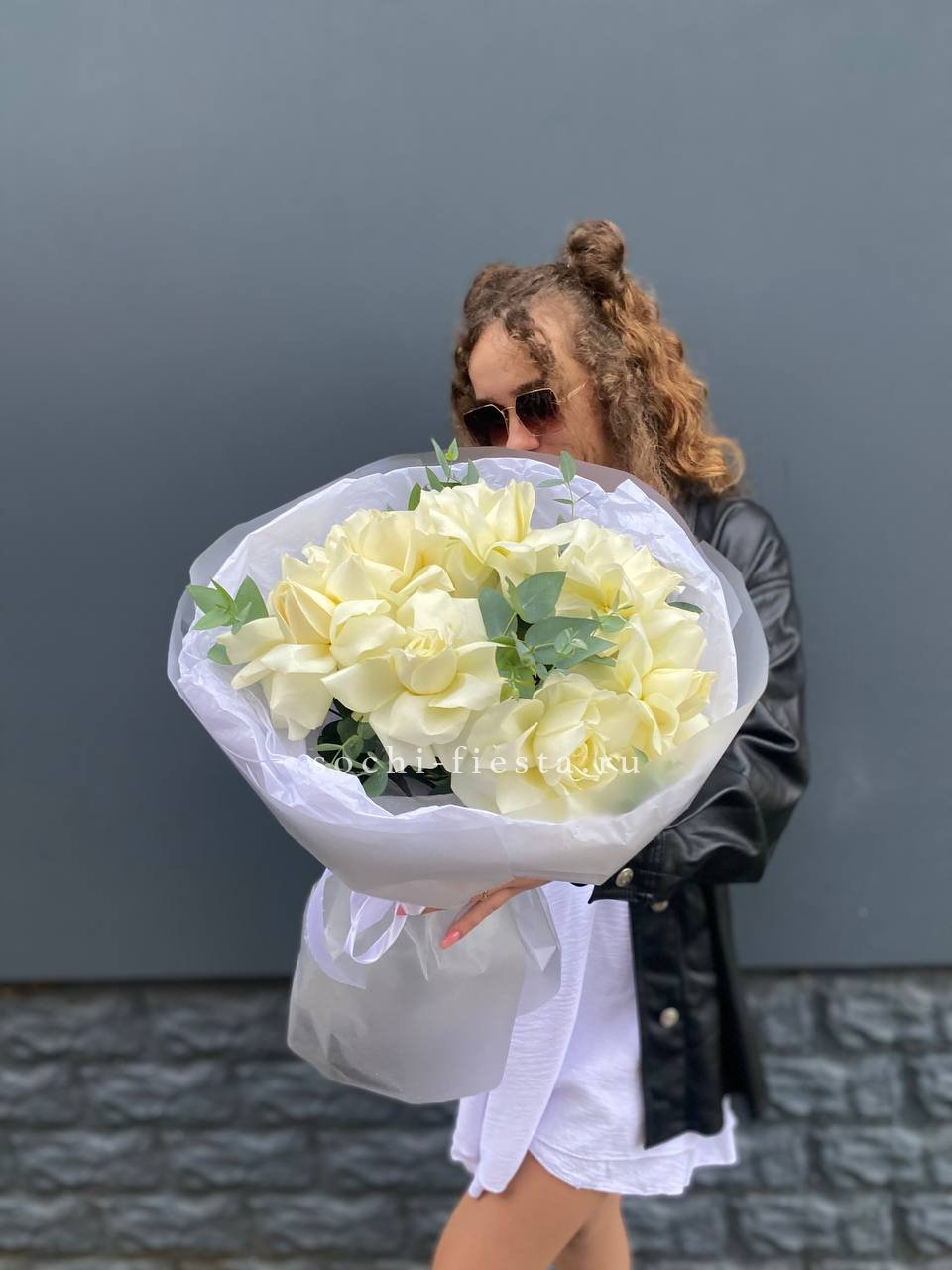 Пятнадцать белых роз в тонкой дизайнерской упаковке создают ощущение лёгкости и чистоты. Матовая текстура бумаги и мягкие складки подчёркивают форму каждого бутона. Композиция выглядит свежо и современно.