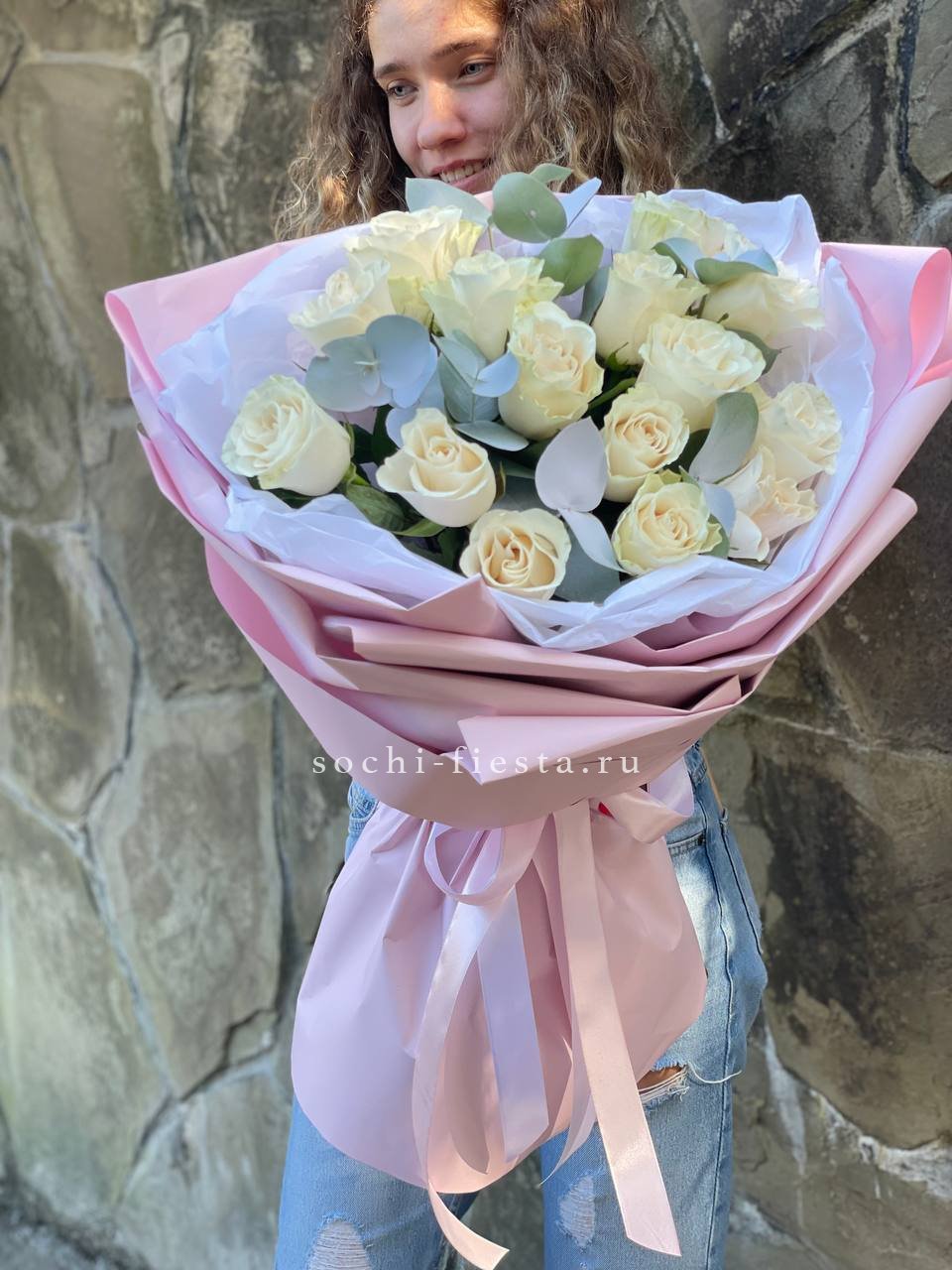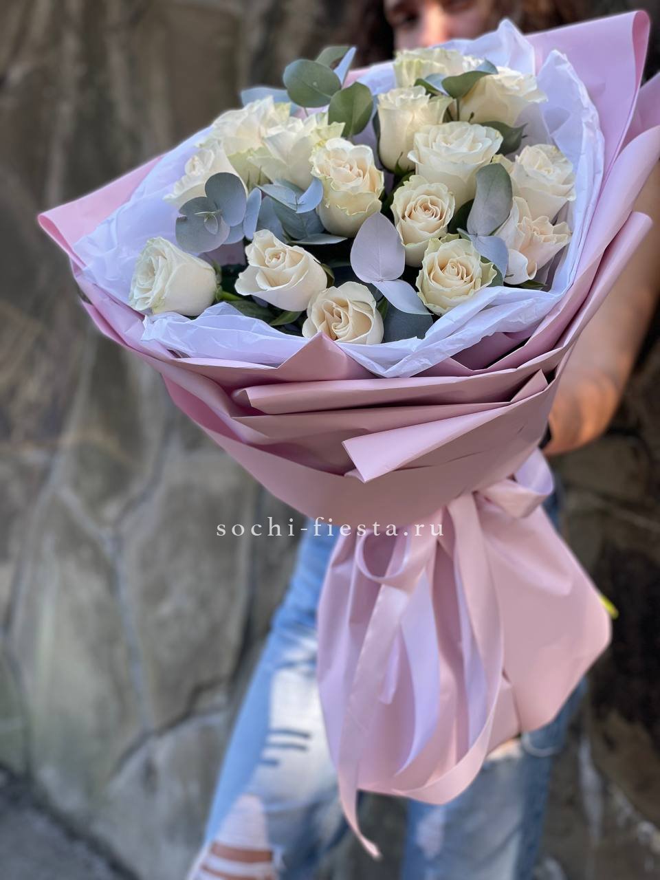 Для заказа товара "Белые розы в авторском оформлении" с доставкой в Кирове нажмите в корзину