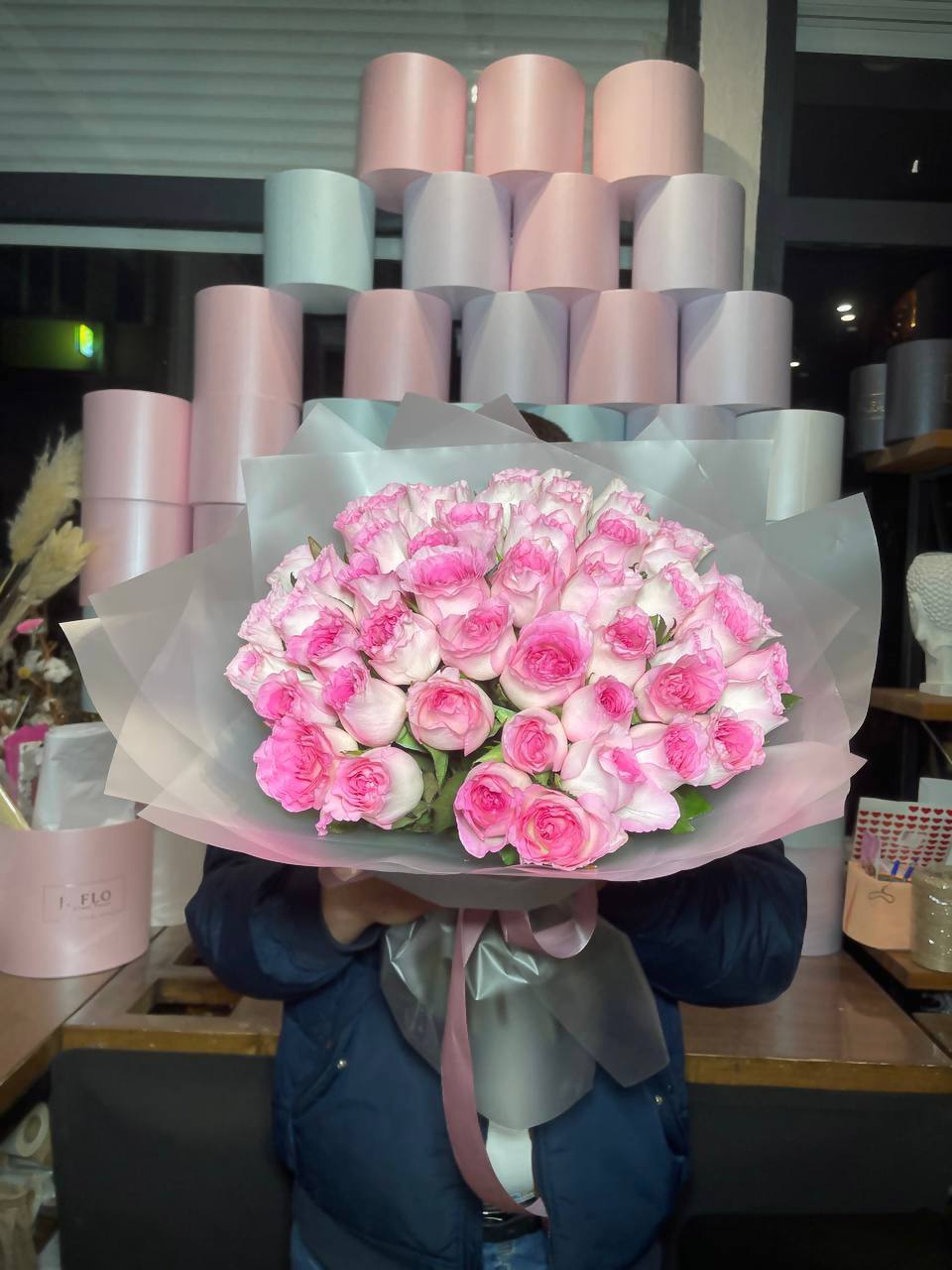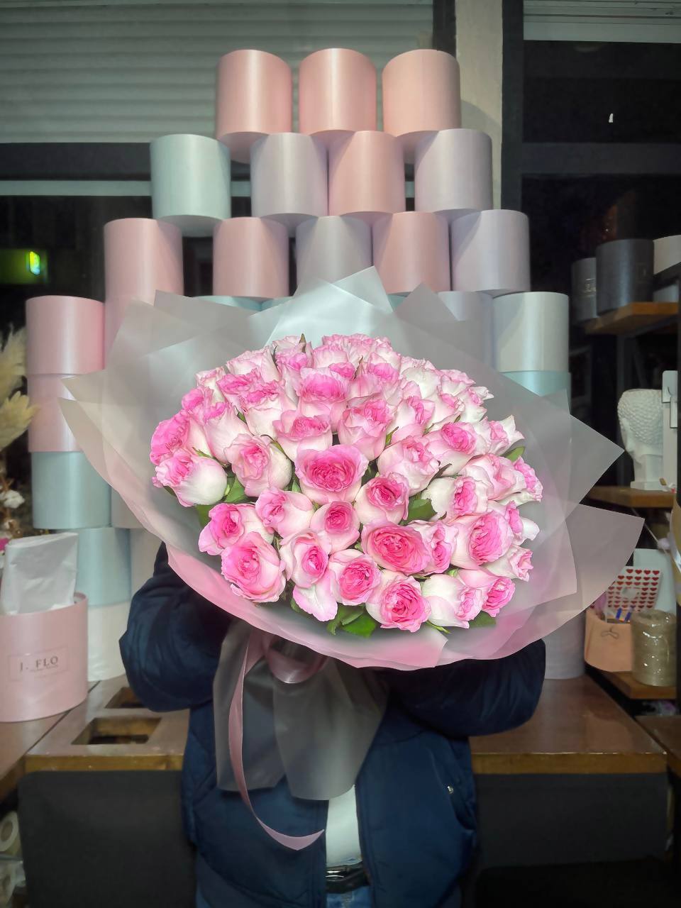 Сто одна роза в розовой гамме выстраивается в масштабную композицию. Такой букет заполняет всё видимое пространство и создаёт впечатление цветочной инсталляции с первого взгляда.