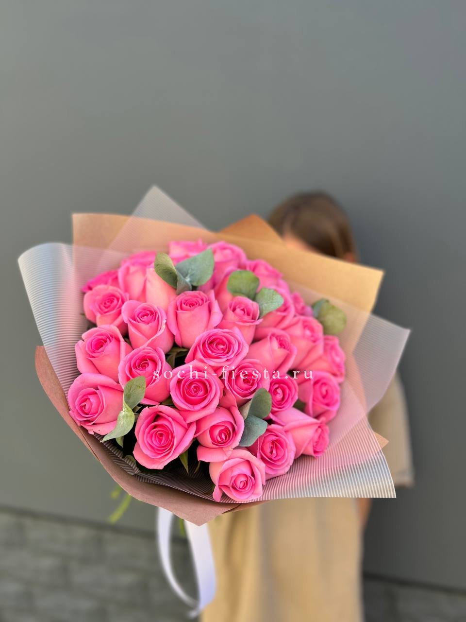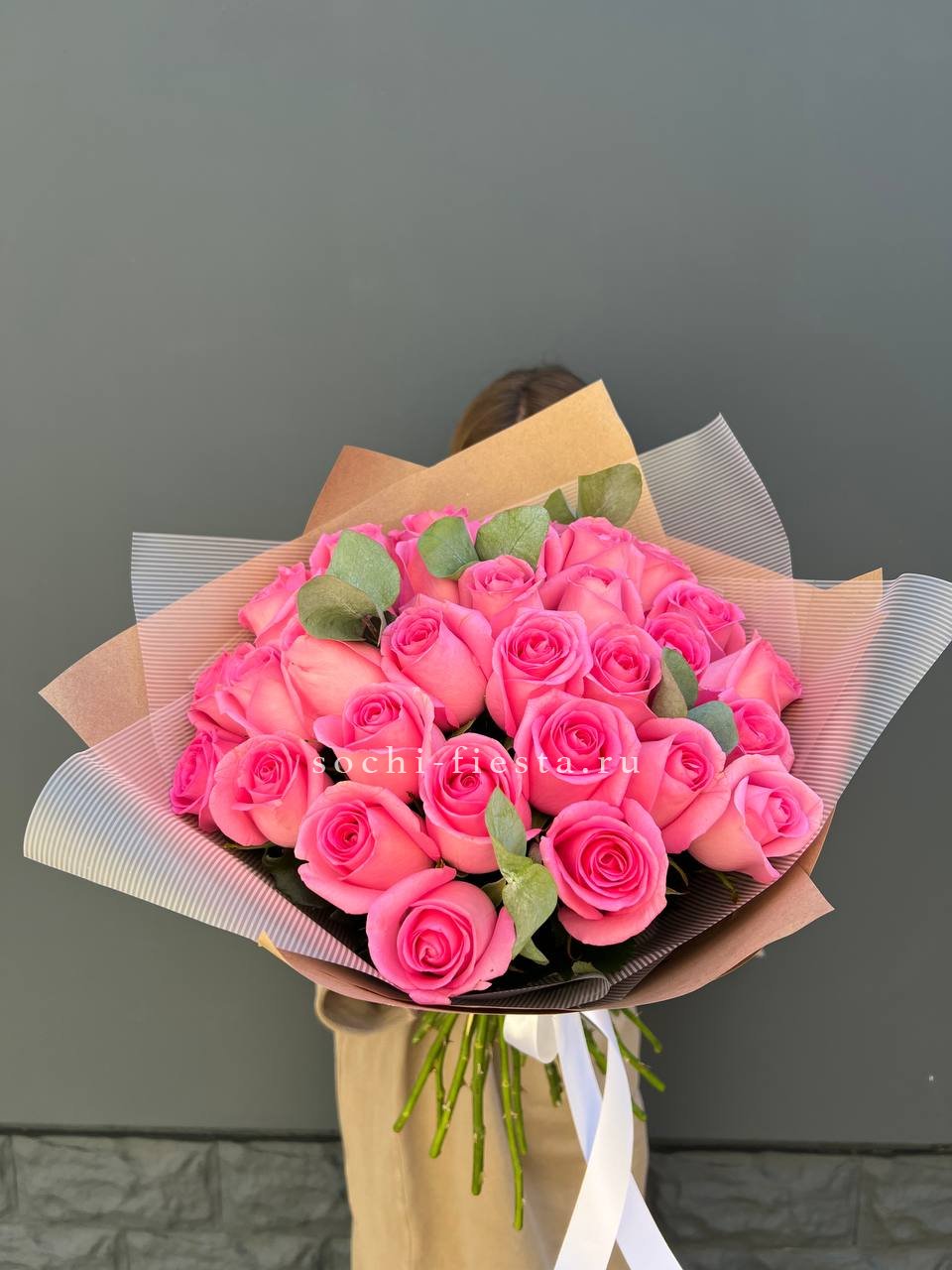 33 розовых роз, эвкалипт, лента, упаковка.