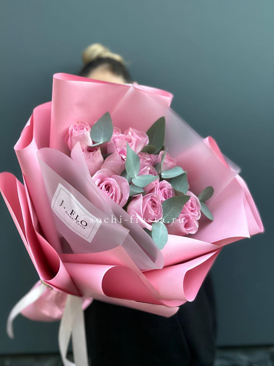 Французские розы Wendi с их фирменным пудровым оттенком раскрываются плавно и объемно. Эвкалипт добавляет воздуха между бутонами и создает естественную глубину композиции.