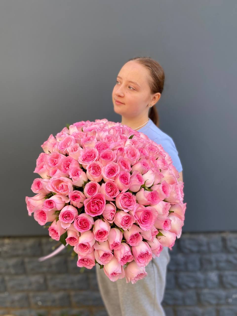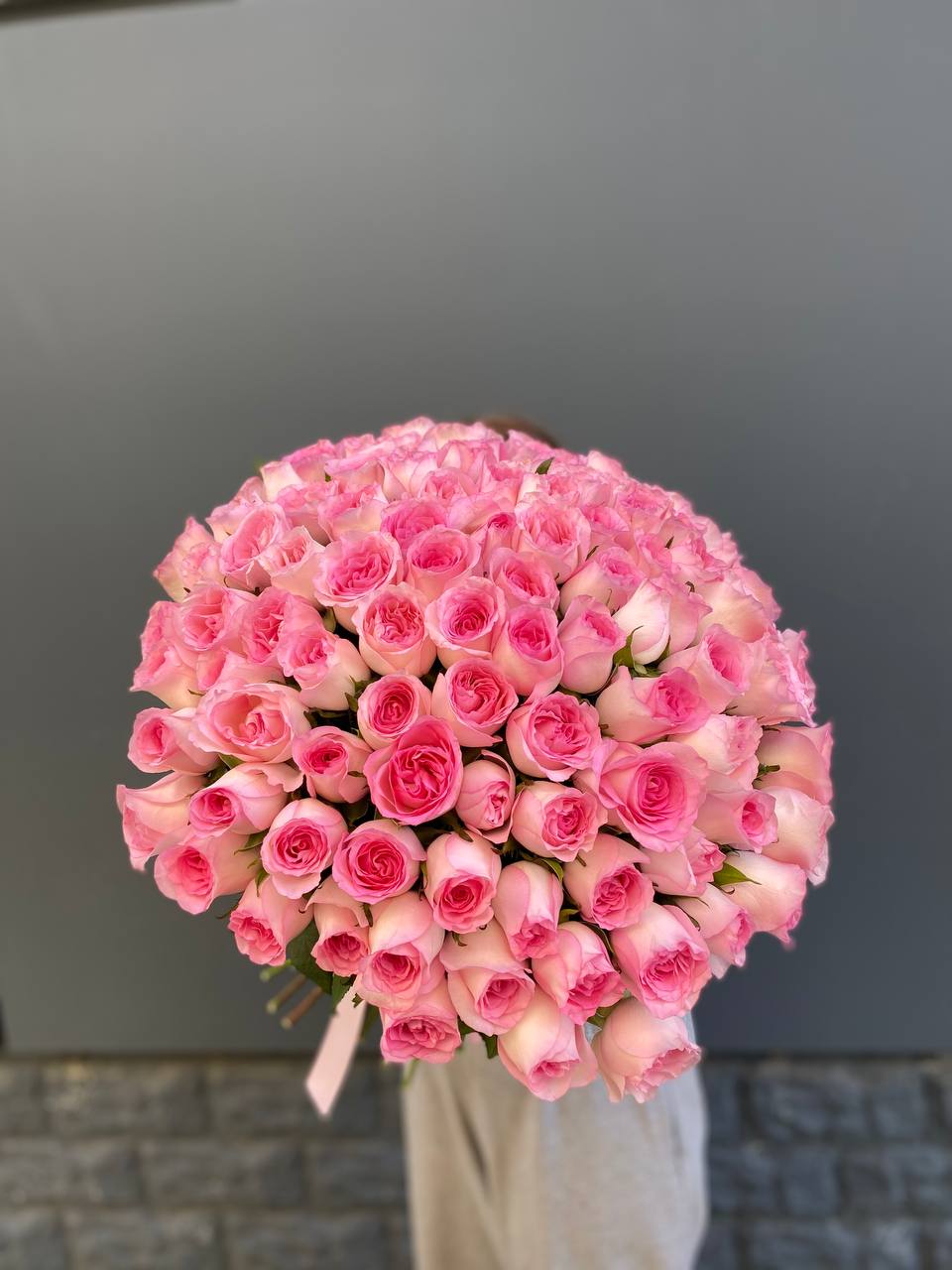 Сто одна роза в охапке создаёт впечатление розового водопада. Масштабная композиция заполняет пространство и становится центром внимания в любой обстановке.
