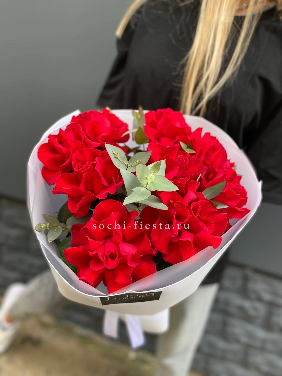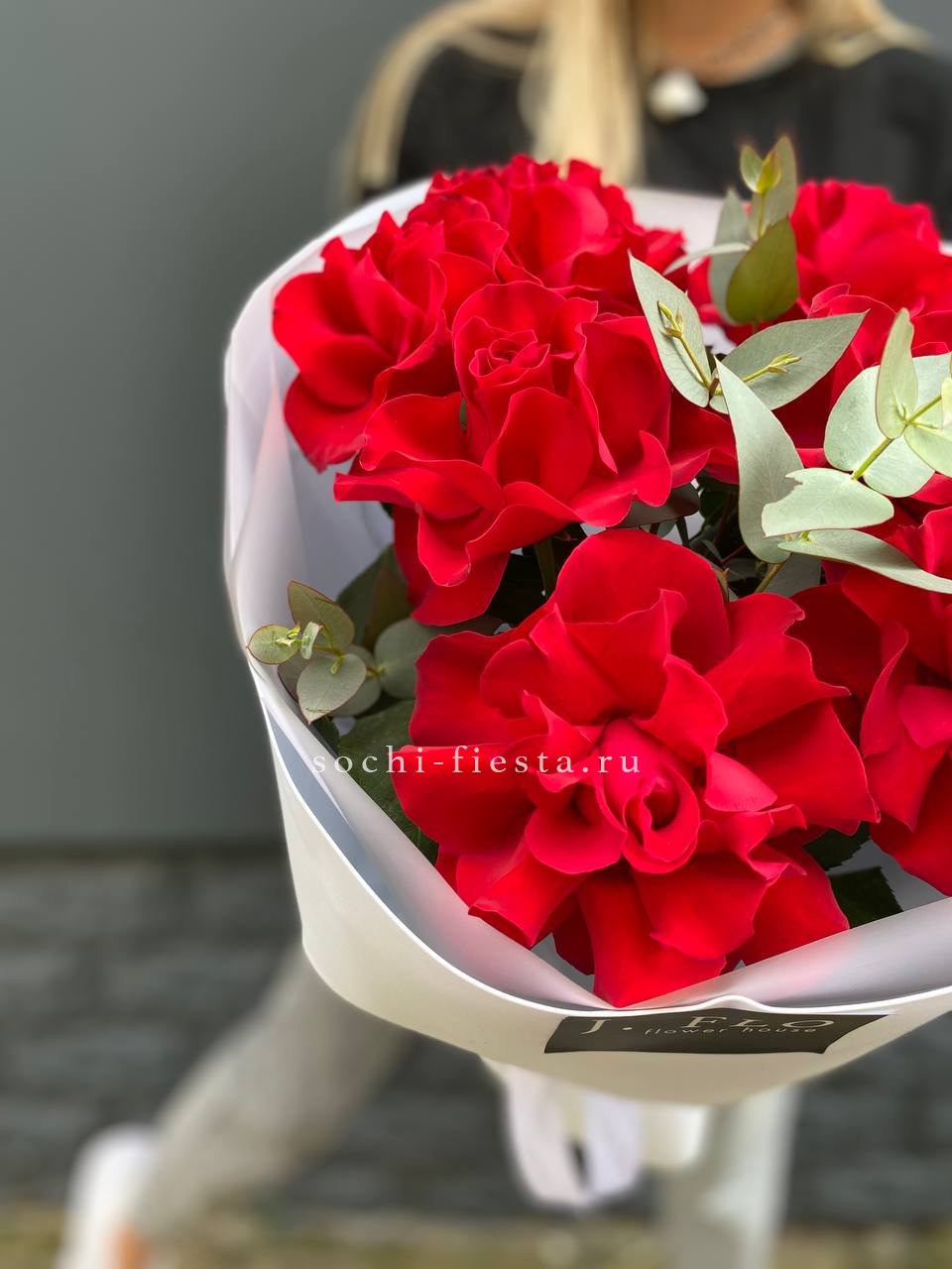 Пять французских роз с вывернутыми лепестками раскрываются широко и создают эффект лёгкой небрежности. Эвкалипт поддерживает форму и добавляет свежести белому цвету.