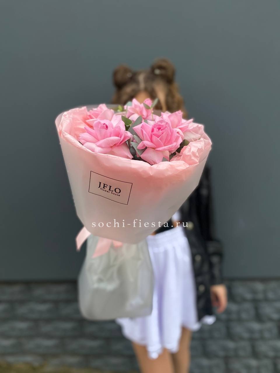 Пять вывернутых роз открывают всю внутреннюю структуру лепестков и демонстрируют розовый цвет во всей его глубине. Эвкалипт обрамляет бутоны и придает букету завершенность.
