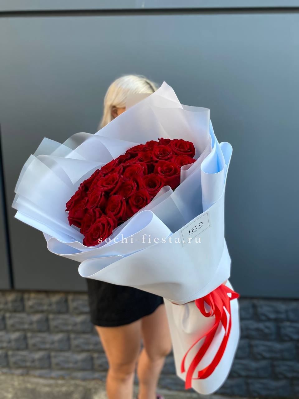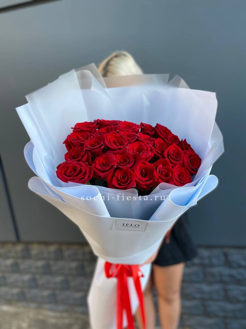 Двадцать пять бутонов выстраиваются в пышную композицию с чётким ритмом и объёмным силуэтом. Голландские розы создают впечатление монументальности и уверенной подачи.