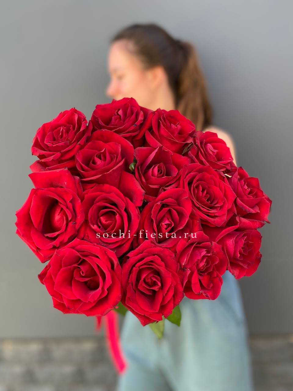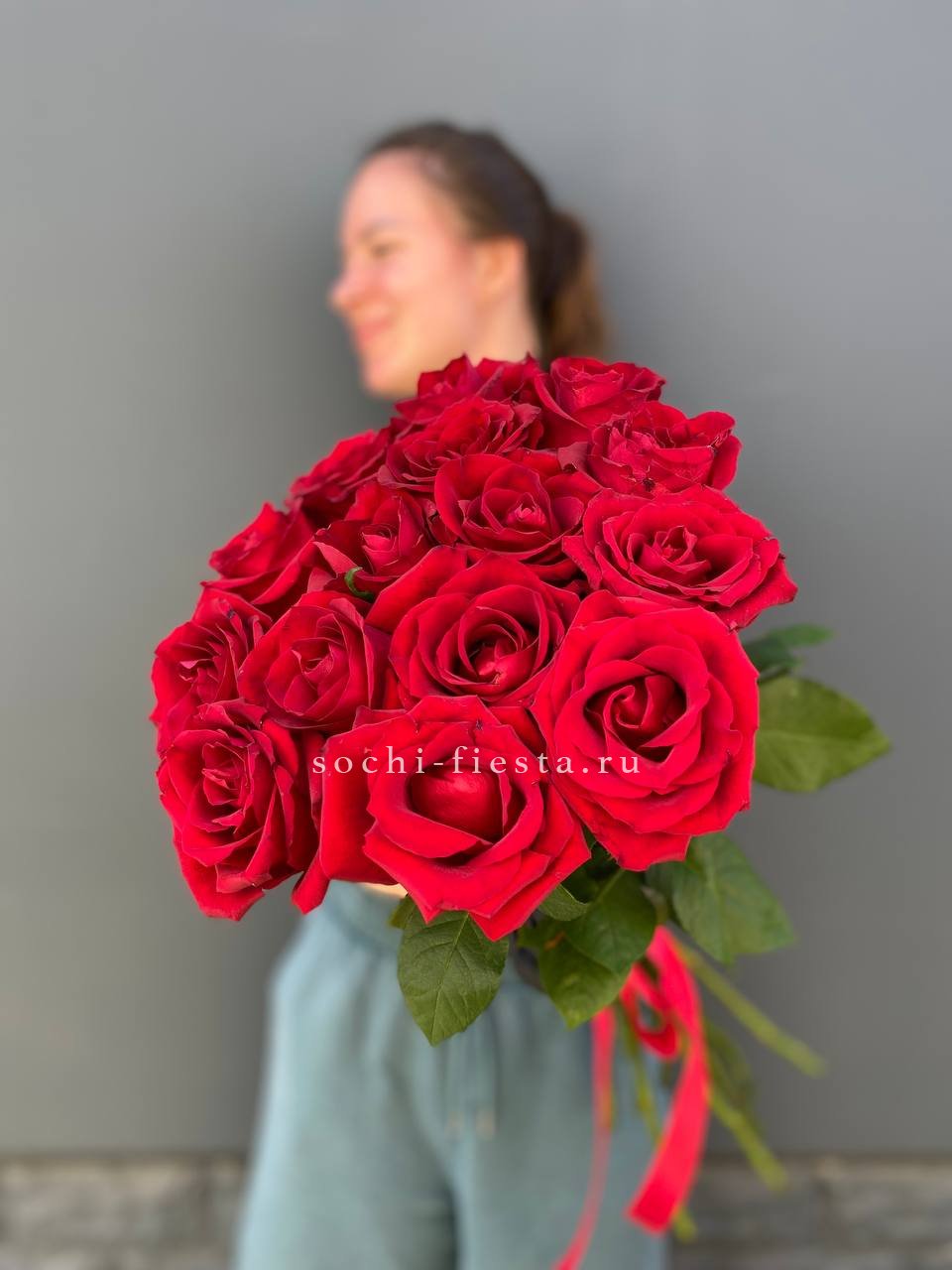 Пятьдесят один бутон насыщенного красного оттенка собраны в плотную композицию. Длинные стебли создают графичный силуэт, а классическая форма сохраняет торжественный характер без лишних деталей.