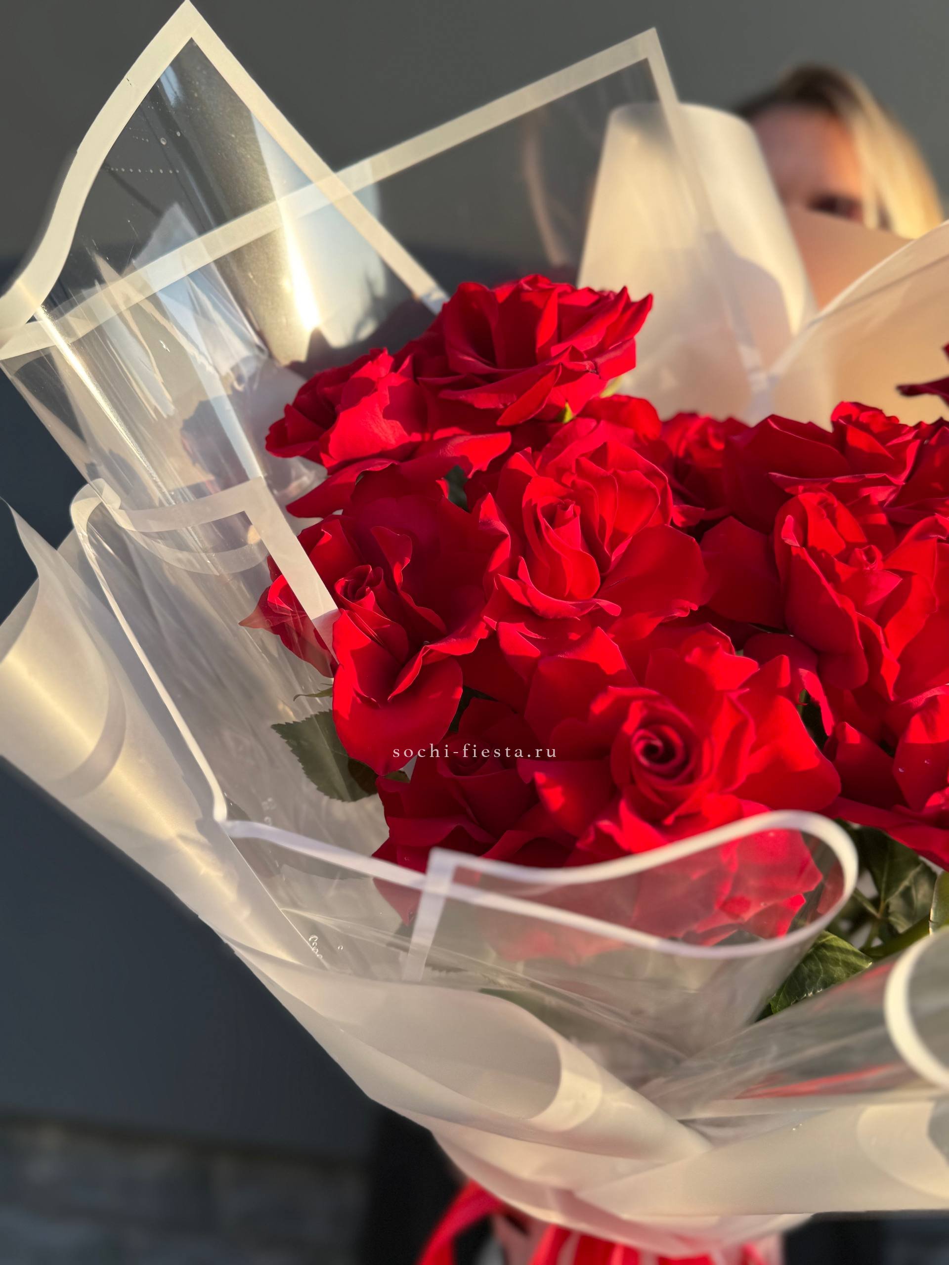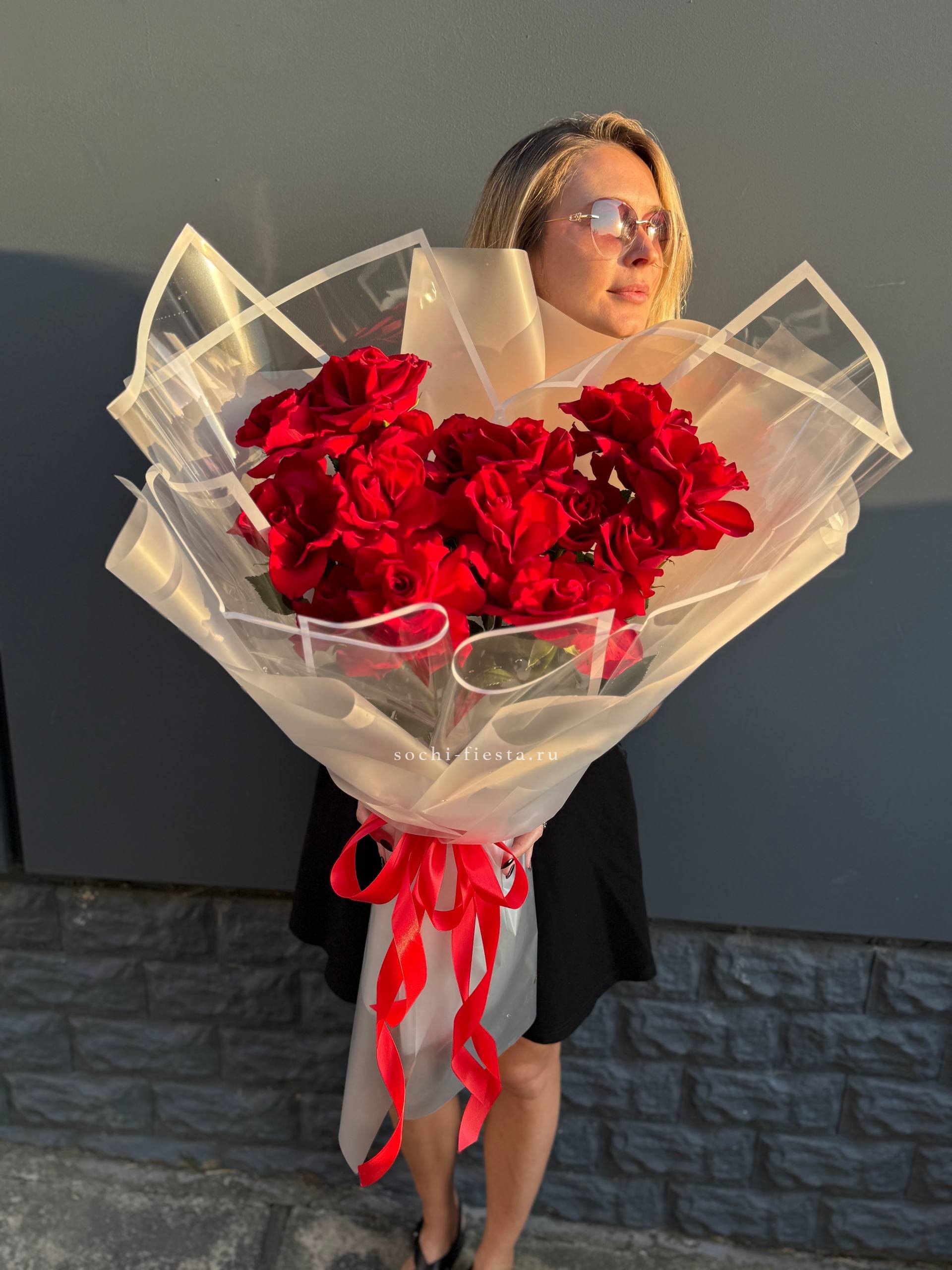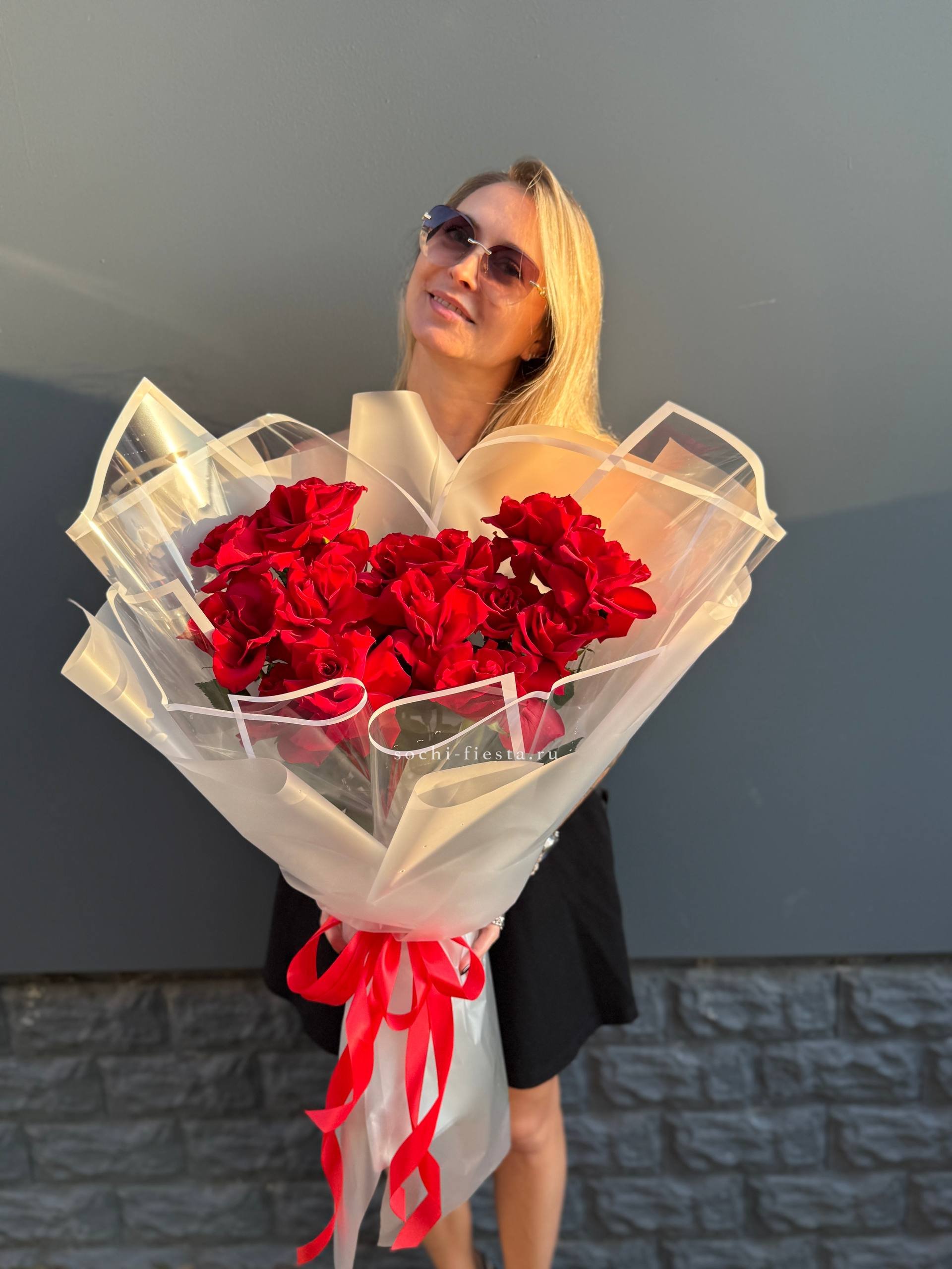 Пятнадцать стеблей собраны в лаконичную форму под прозрачной плёнкой. Букет держит линию и остаётся свежим долгое время благодаря качеству бутонов.