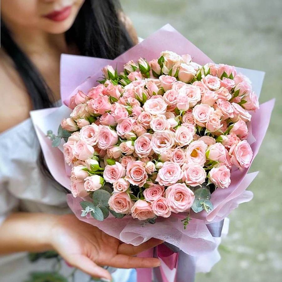 25 пионовидные кустовые розы,  хлопок, лента, дизайнерская упаковка.