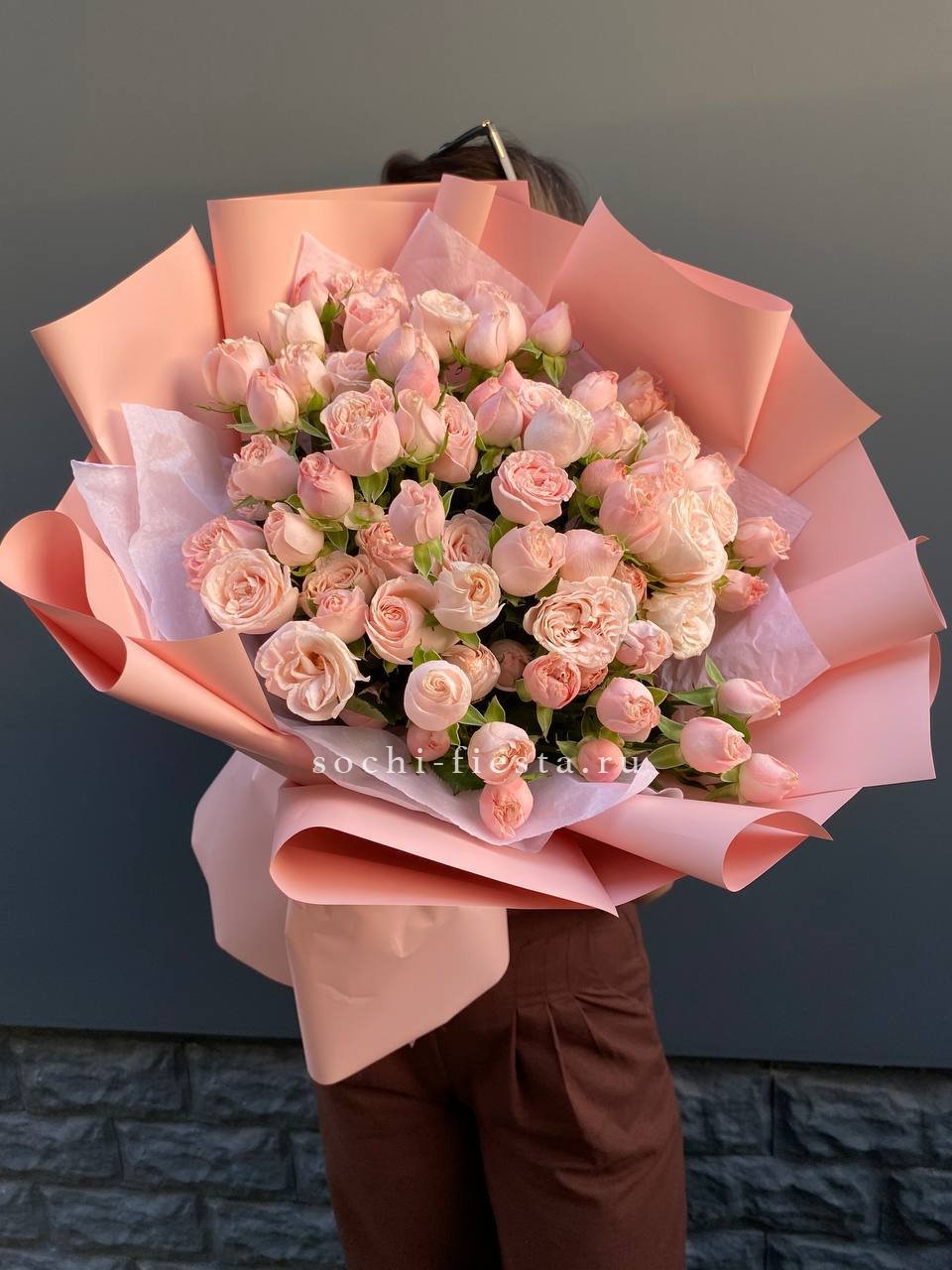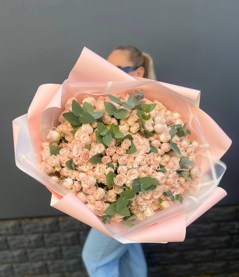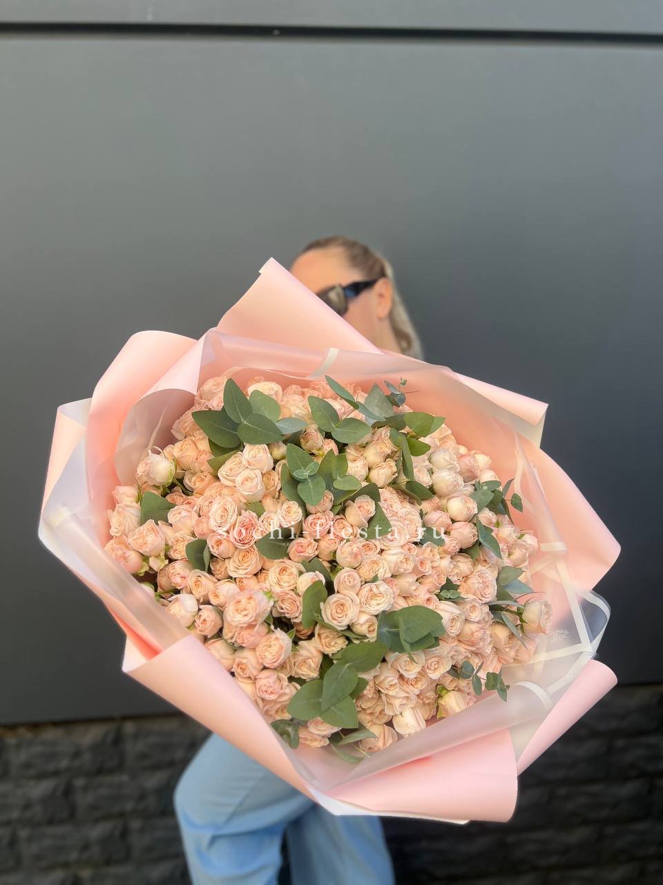 101 кремовая кустовая роза, эвкалипт, лента, дизайнерская упаковка.