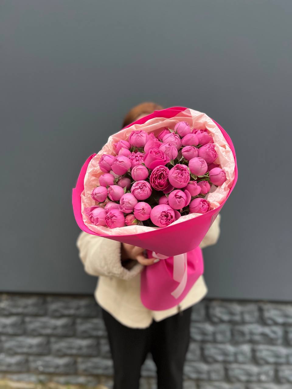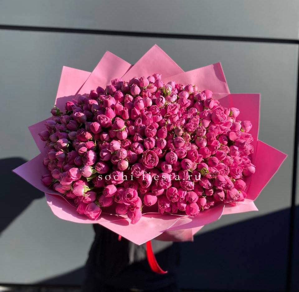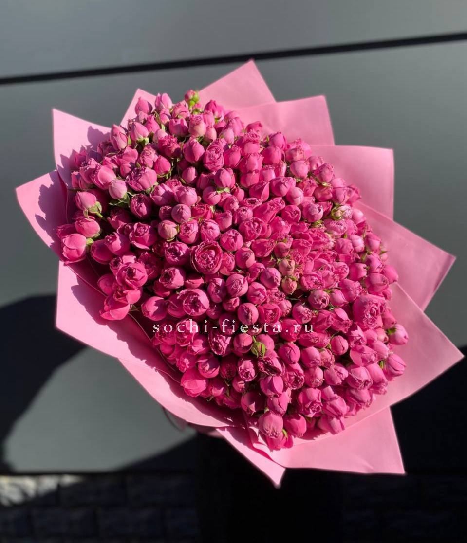 Девять кустовых роз собраны в компактную форму с мягким розовым оттенком. Множество небольших бутонов создают объемную текстуру и природную легкость. Букет упакован в матовую бумагу с лентой.