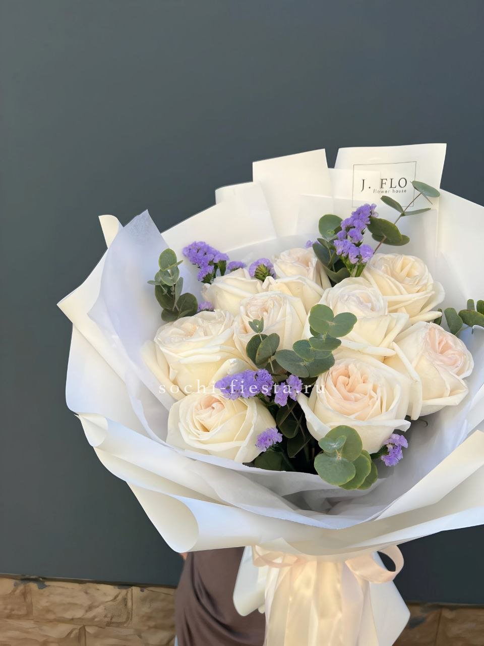 Девять белых роз White O'Hara дополнены статицей и эвкалиптом для воздушности. Многослойные лепестки раскрываются постепенно, создавая глубину и объем в компактной форме.