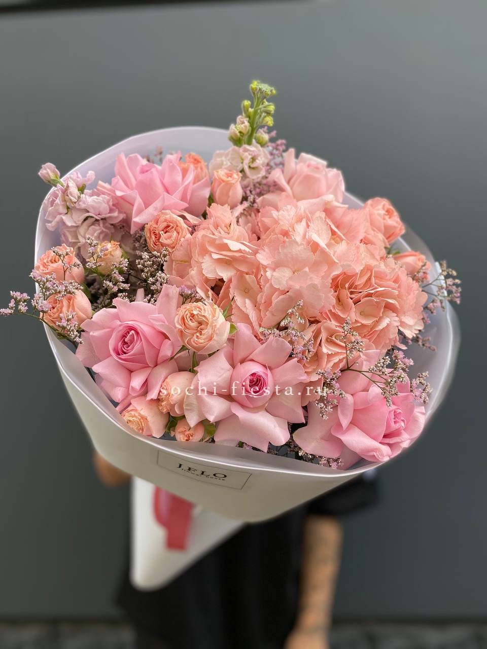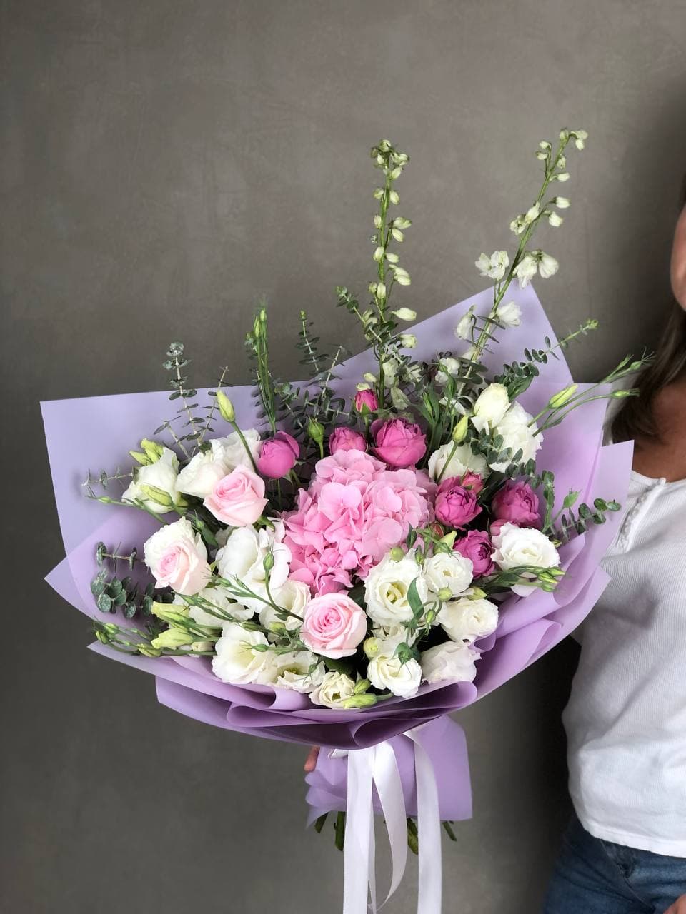 гортензия, герберы, эустомы, розы, диантус, эвкалипт, лента, дизайнерская упаковка.