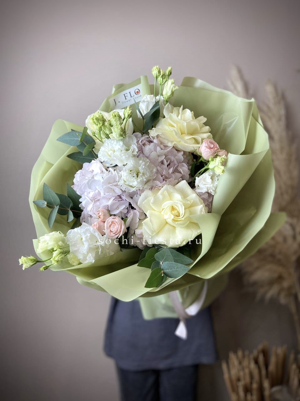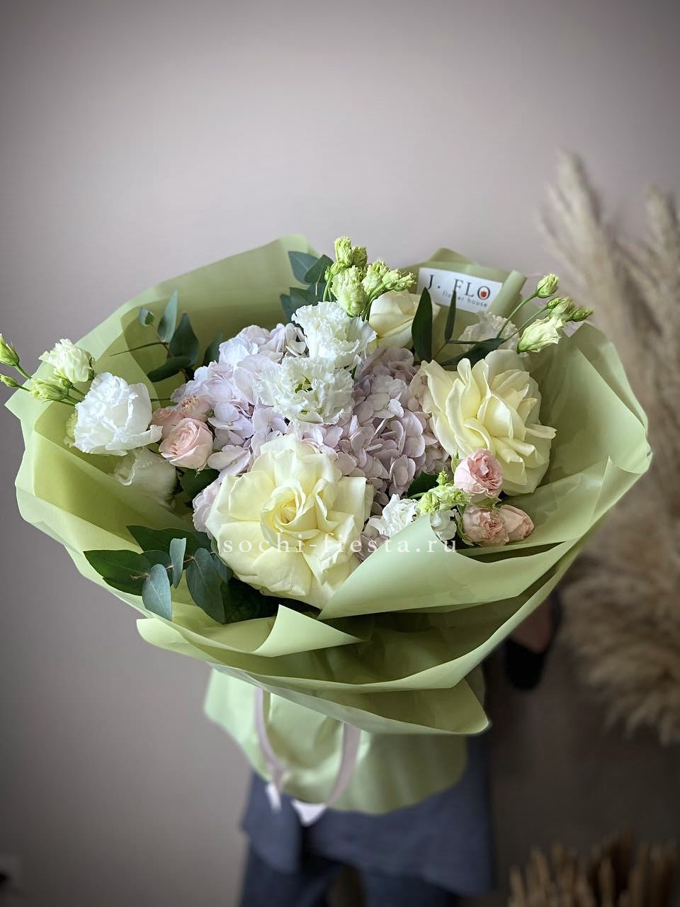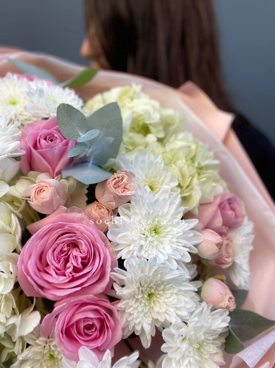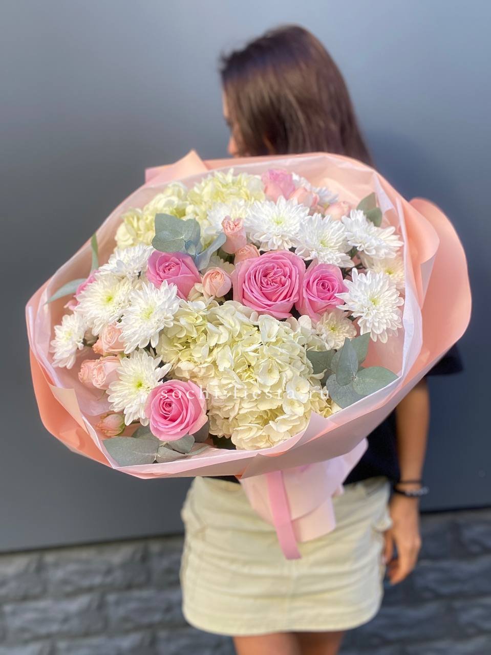 маттиола, розы, гортензия, диантусы, хризантемы , лента и дизайнерская пленка.