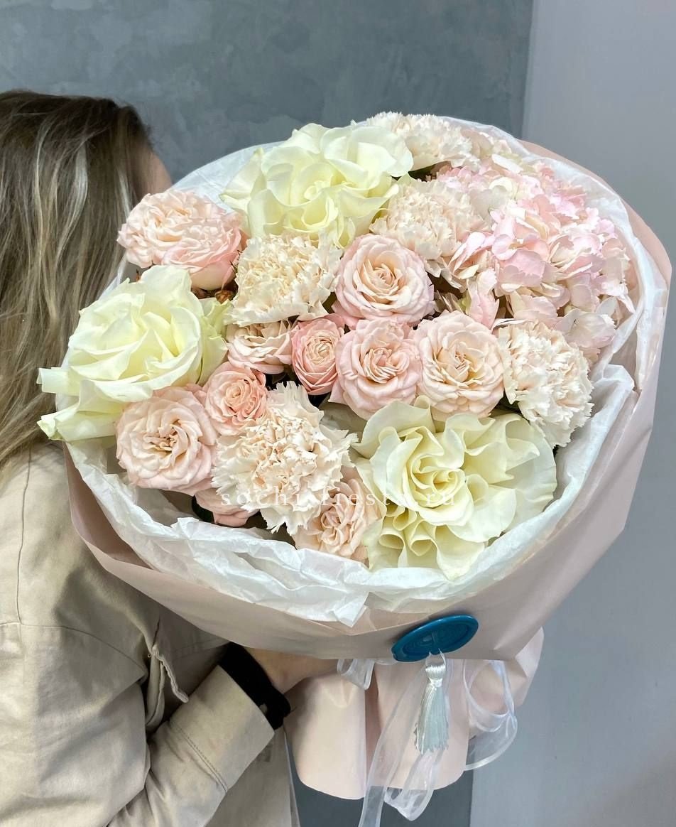 Плотная сборка с пышными соцветиями гортензии и яркими герберами создает объемный силуэт. Маттиола и лимониум добавляют воздушности по краям, а диантусы заполняют центр мягкими переходами.