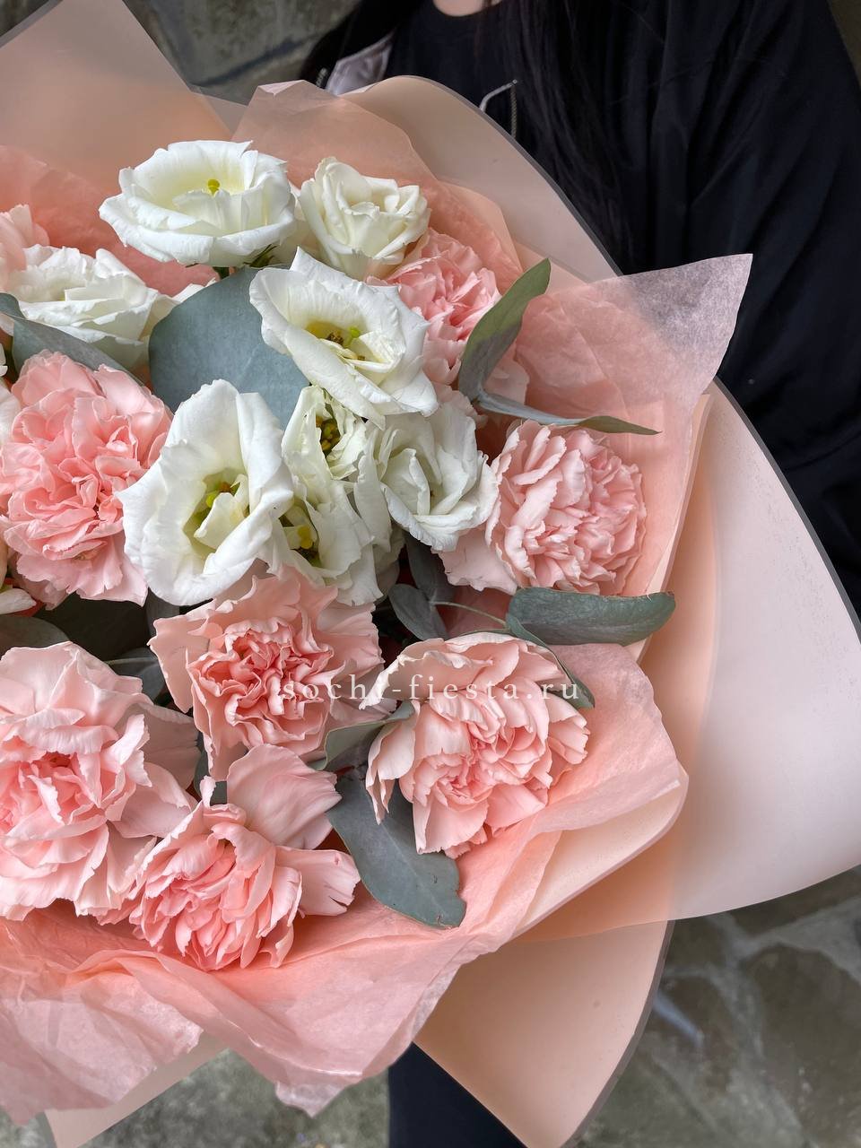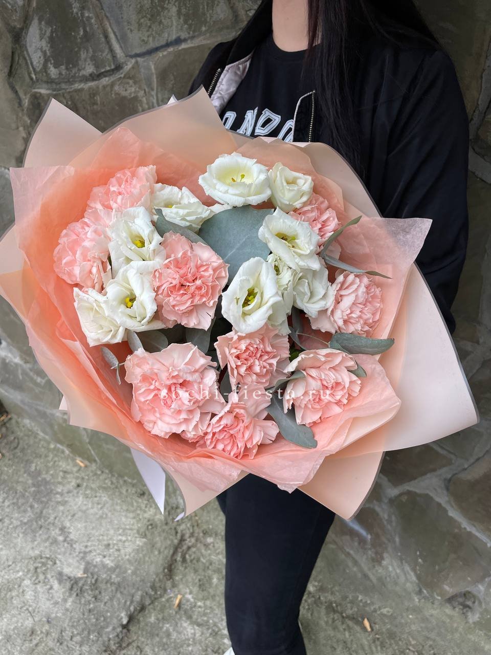 Воздушные диантусы персикового оттенка раскрываются пышными шапками среди нежной эустомы. Ветви эвкалипта придают букету свежесть и легкую графичность.