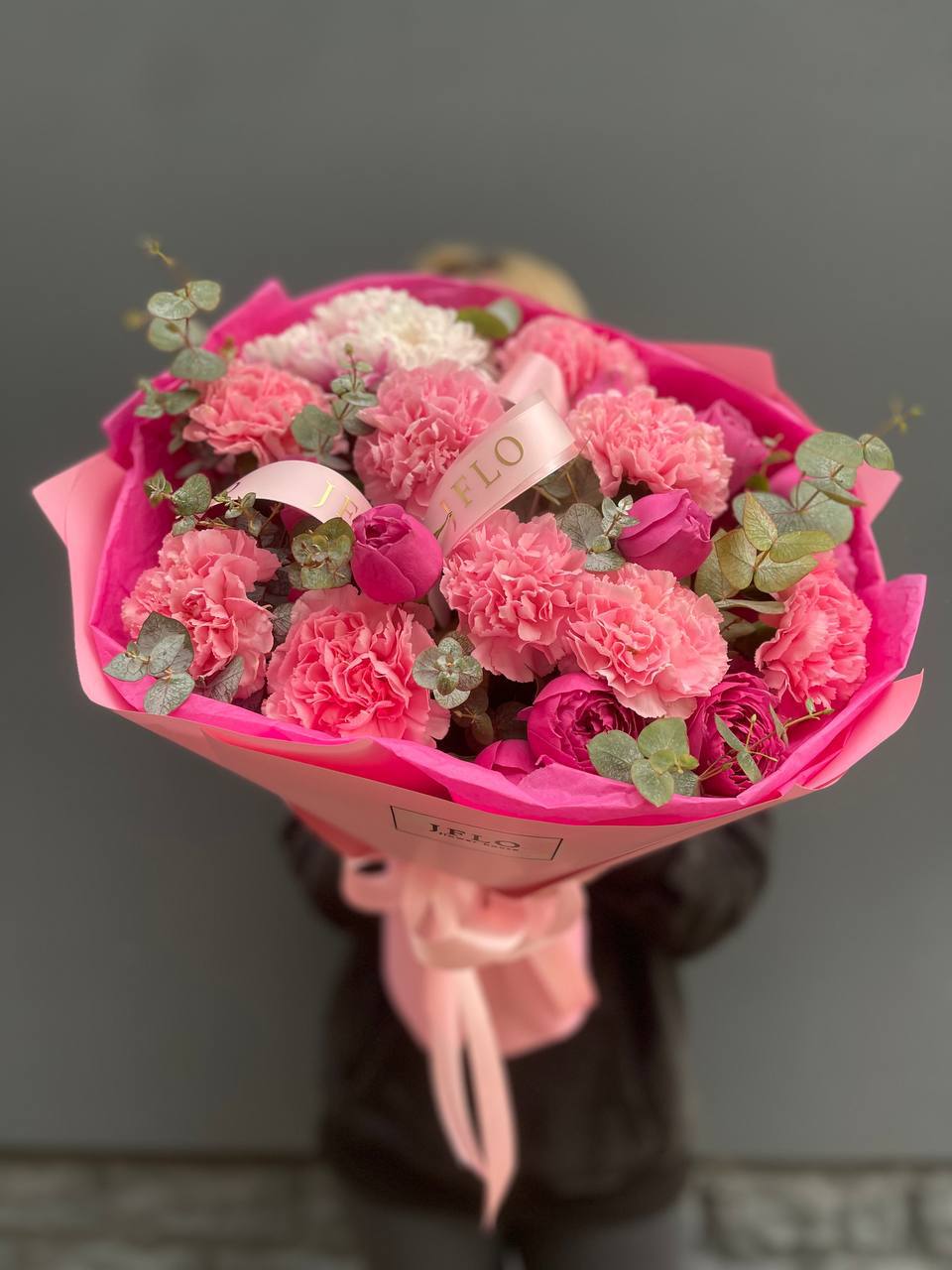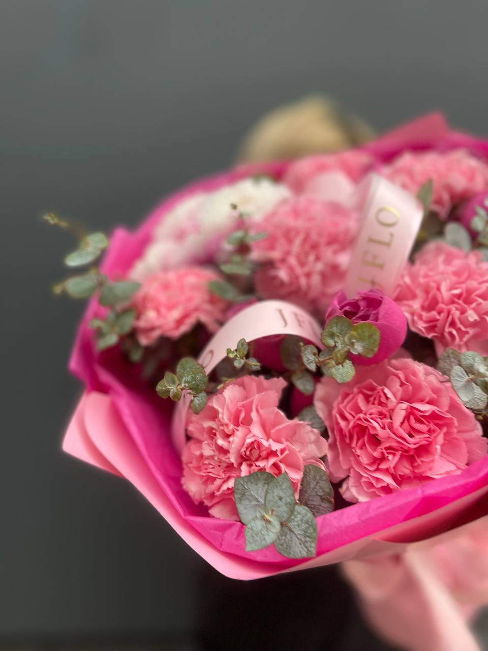 диантус, бомбастик, белые розы, эвкалипт, эустома, упаковка.