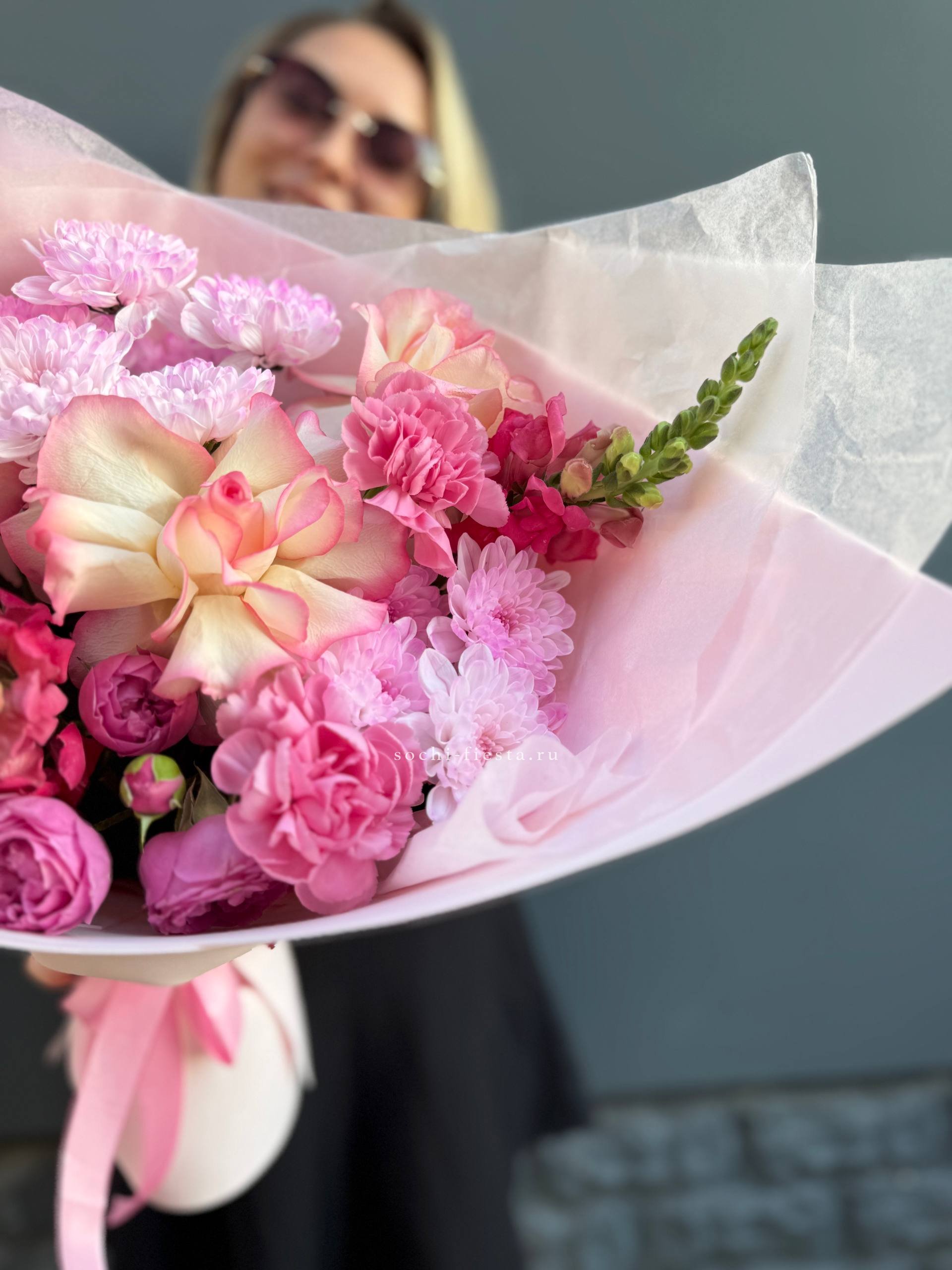 джумилия, хризантема, антиринум, диантус, мисти баблс, упаковка.
