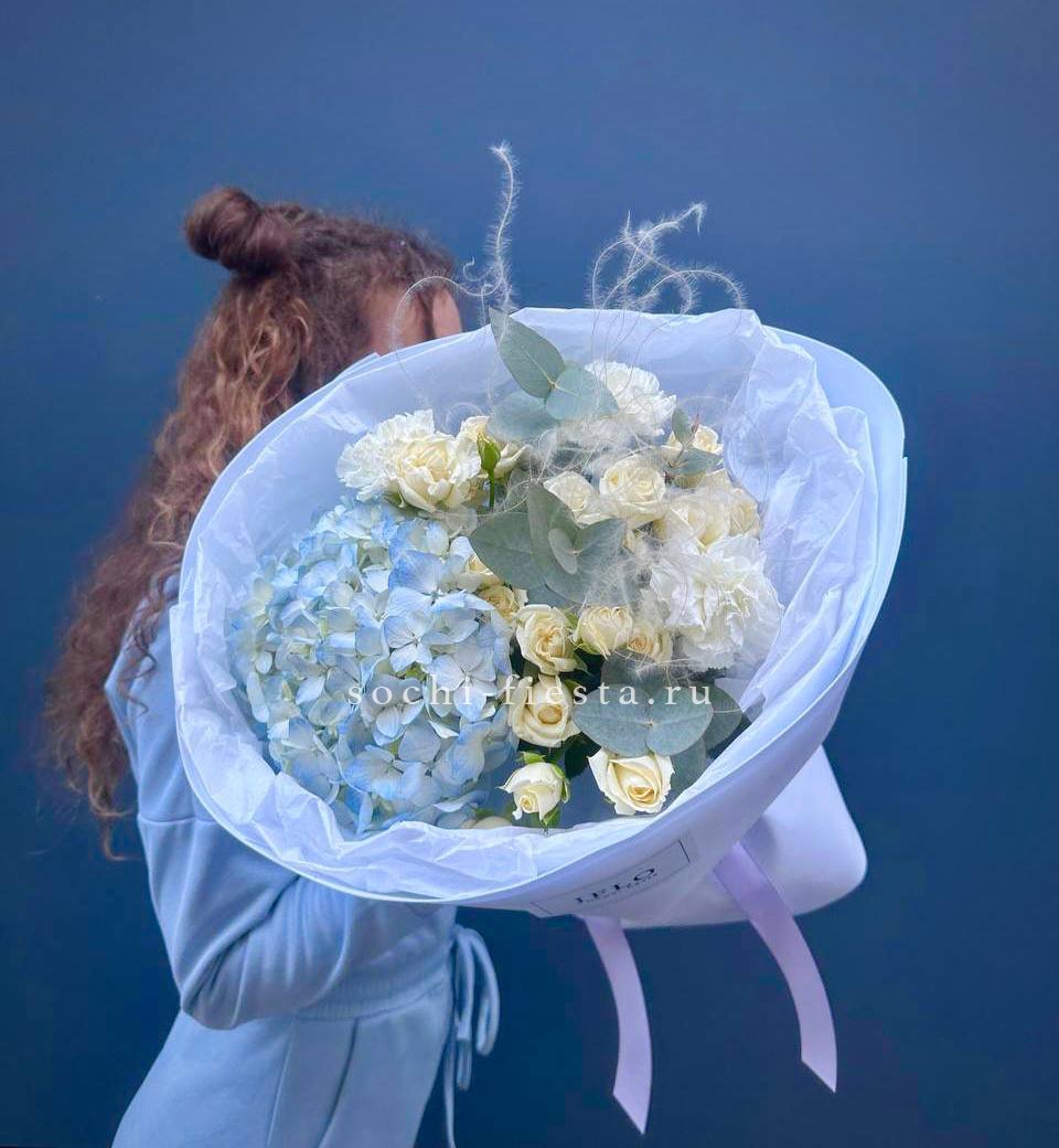 гортензия, роза кустовая, ковыль, лента, дизайнерская пленка.