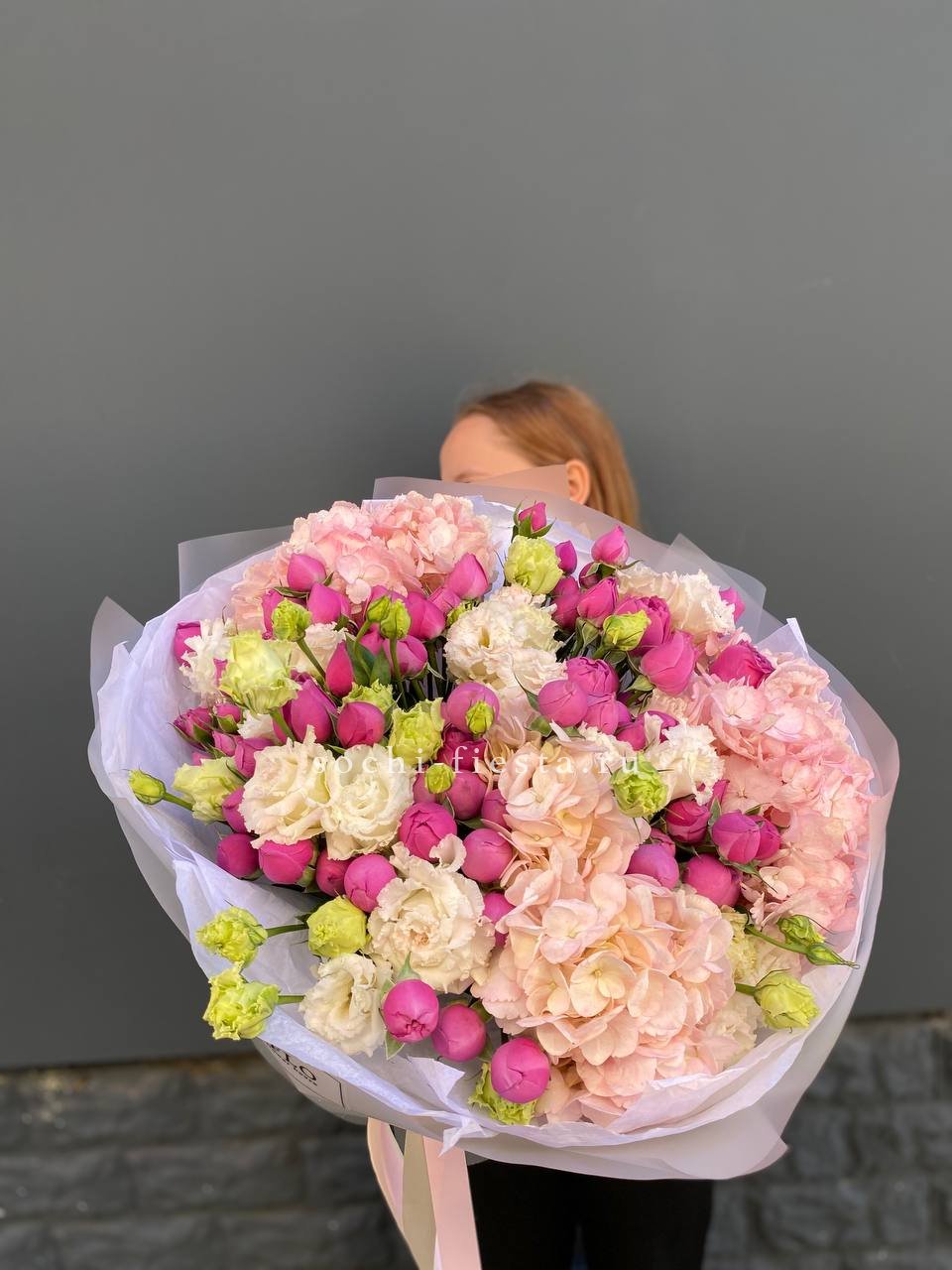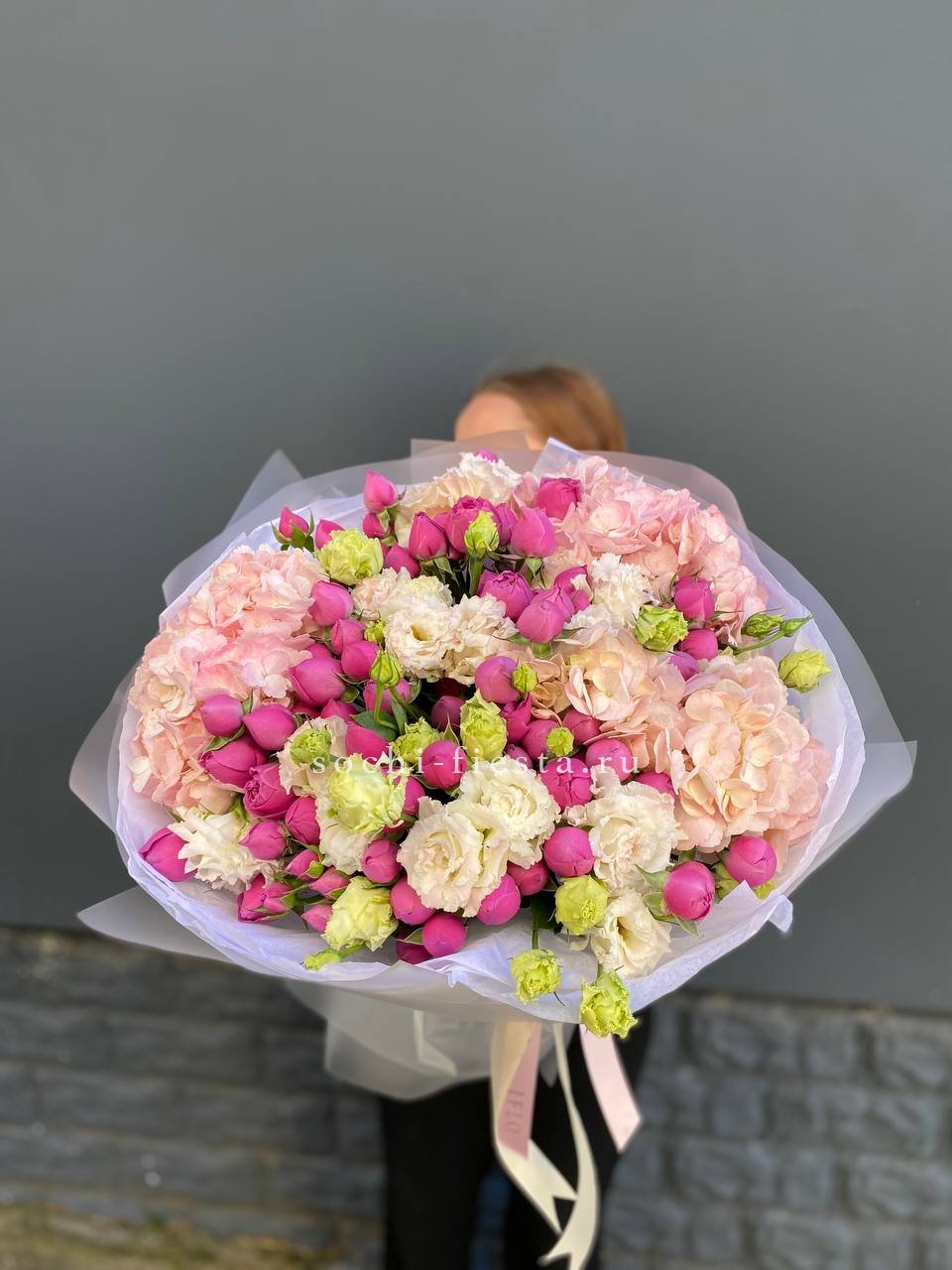 Пышные шапки гортензии задают объём, а россыпь кустовых роз создаёт живую текстуру по всей форме. Композиция наполнена воздухом и естественной лёгкостью.
