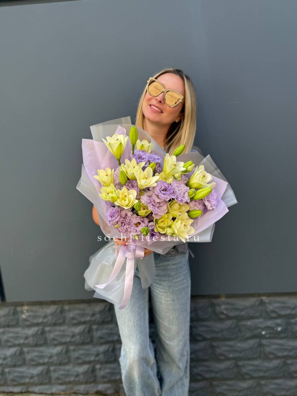 лилии, эустомы, дизайнерская упаковка.
