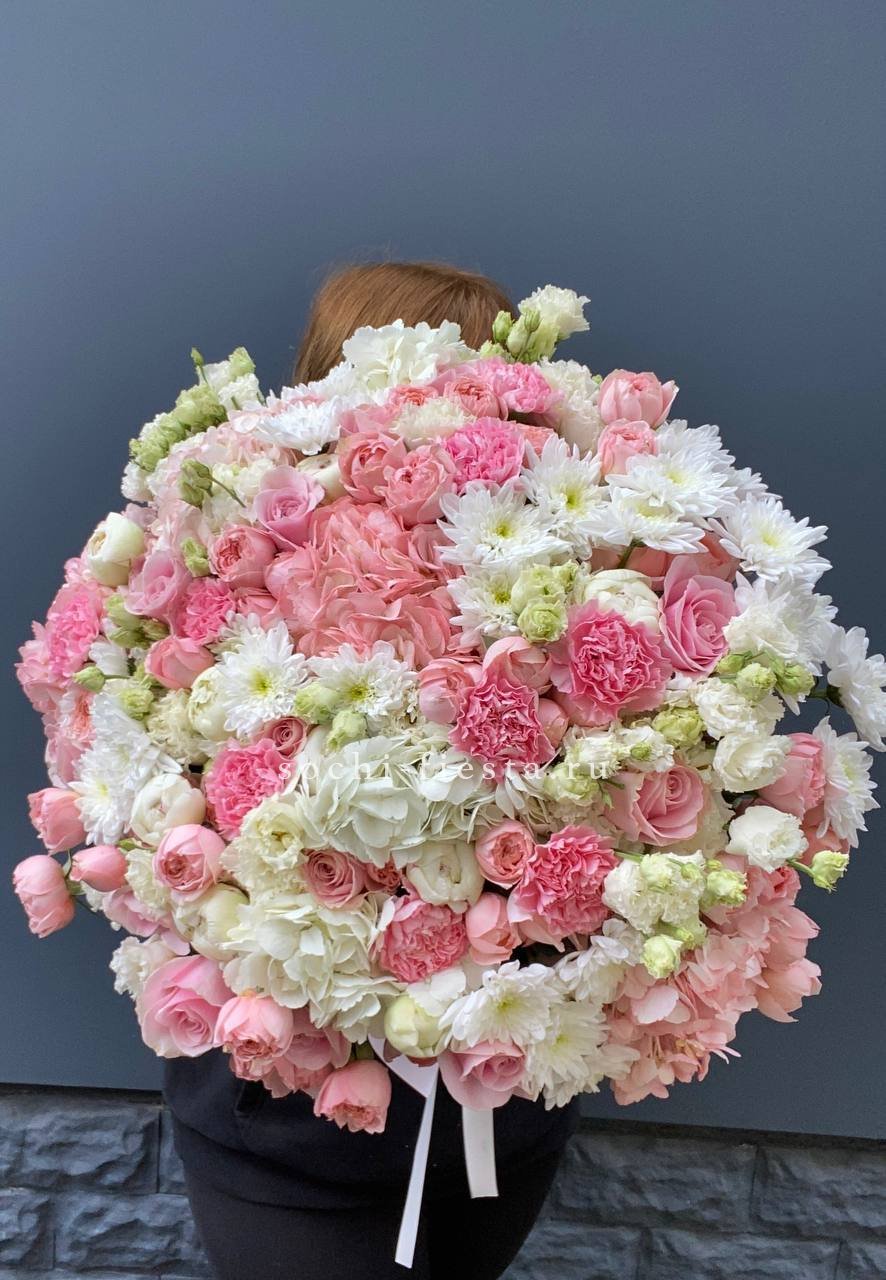 Розовые розы и диантусы окружены пышными соцветиями маттиолы и бомбастика. Композиция собрана плотно, каждый цветок поддерживает соседний, создавая объемную округлую форму. Букет держит силуэт и выглядит цельно с любого ракурса.