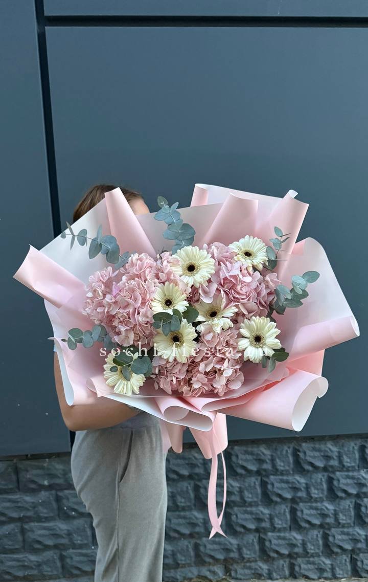 диантус, гербера, кустовая роза, роза белая, лимониум (замена в несезон), дельфиниум/маттиола/львиный зев/гладиолус (замена в несезон), лента, авторская упаковка.