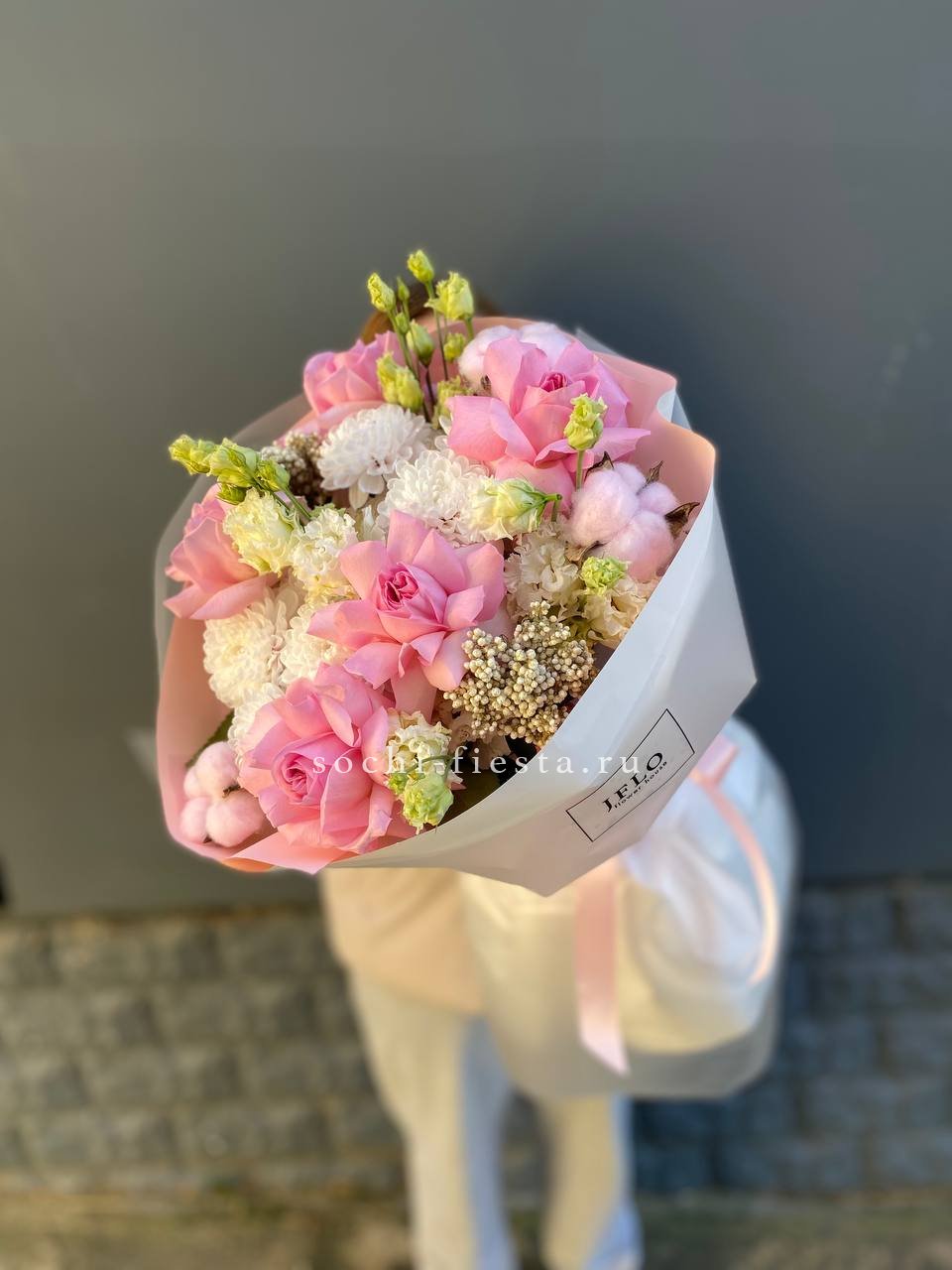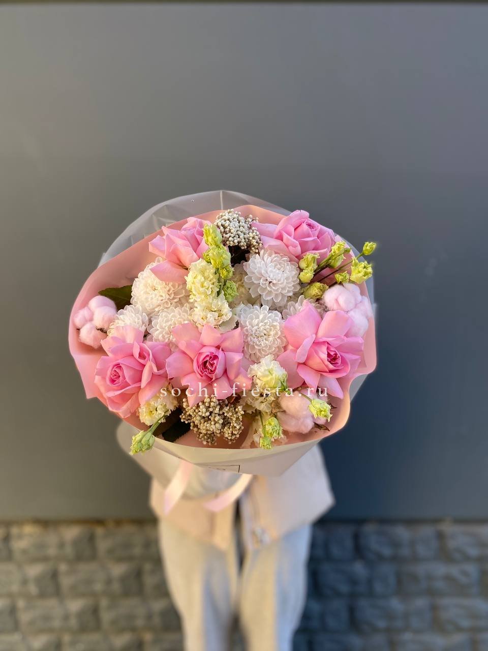 гортензия, белая роза, диантус, хризантема, эустома, озатамус, пленка.