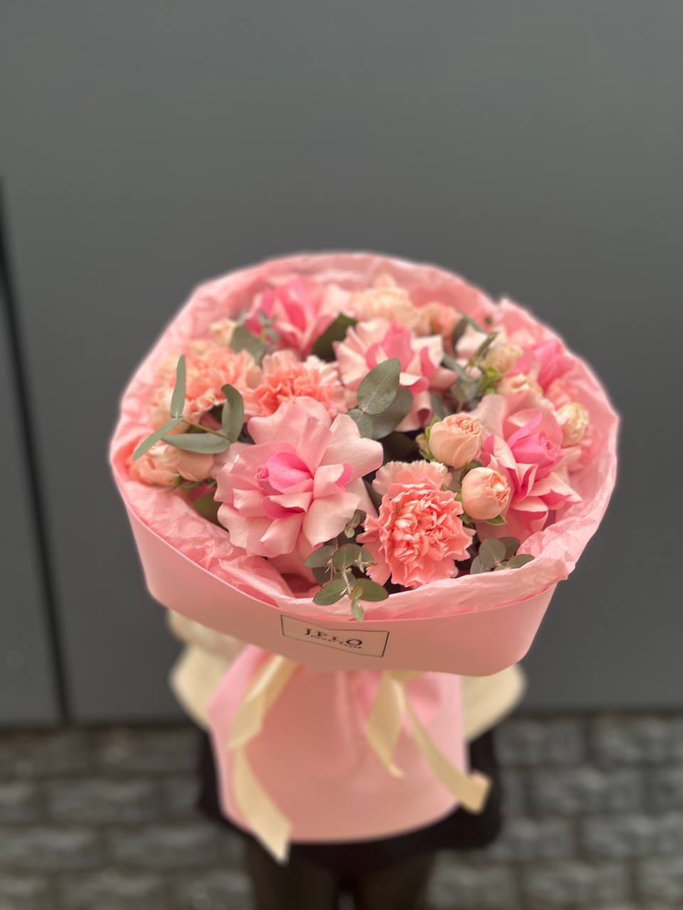 Кустовые розы и эустомы собраны в компактную форму с мягкими линиями. Сочетание нескольких оттенков создаёт живописный эффект без лишней пышности.