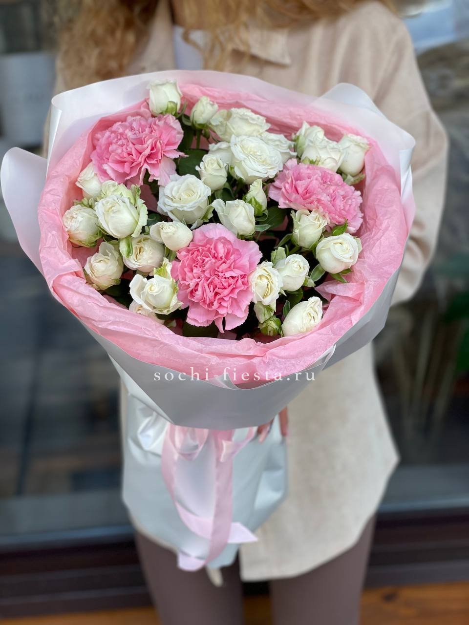 Плотные головки диантусов рассыпаны между кустовыми розами, создавая живую текстуру. Компактная форма букета удобна для небольших пространств и долго сохраняет свежесть.