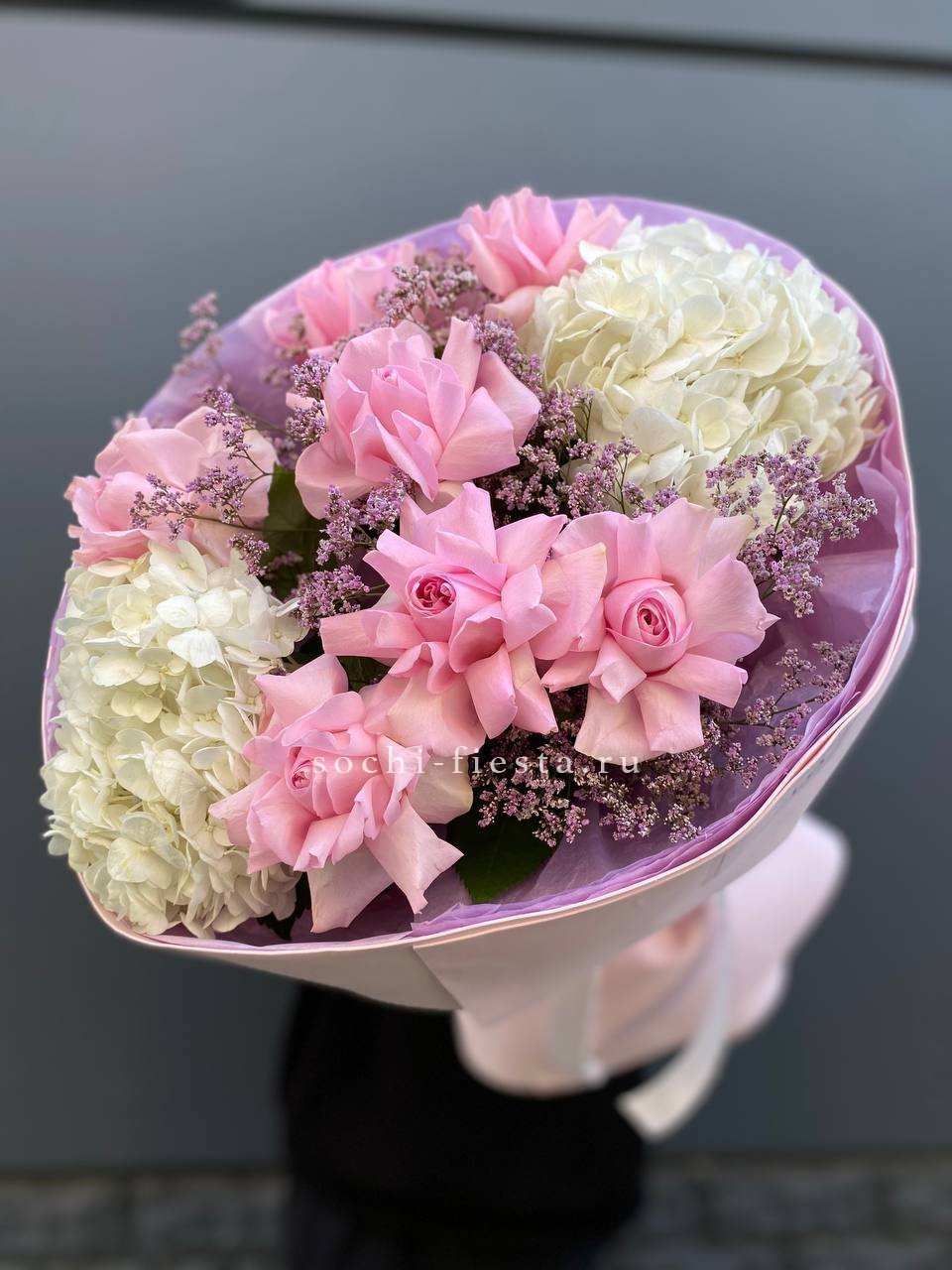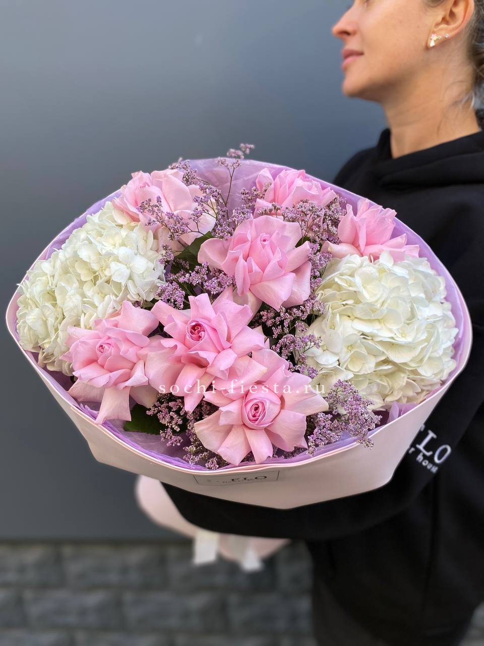Для заказа товара "Букет с гортензией и белыми французскими розами" с доставкой в Кирове нажмите в корзину