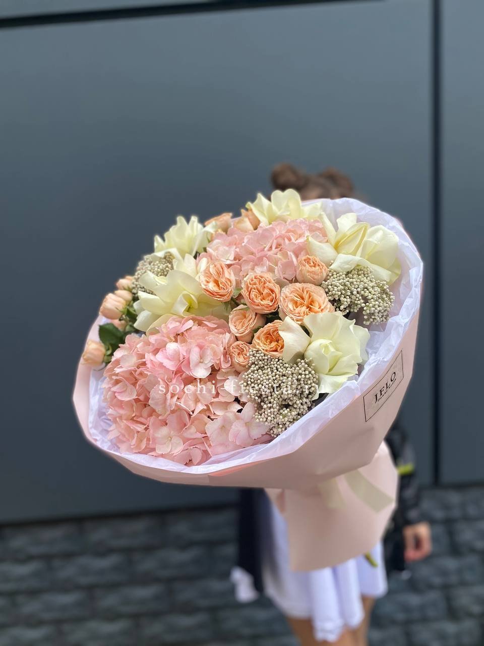 Гортензия обволакивает пионовидные и классические розы мягким облаком. Озотамус добавляет воздушности, создавая объёмную композицию с природной непринуждённостью.