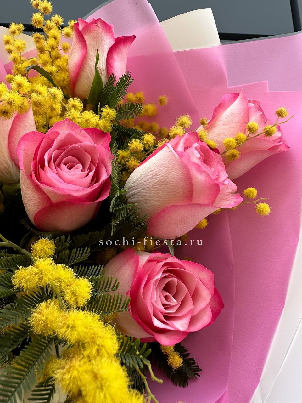 Солнечная мимоза встречается с яркими гербераами и розами Венди в жизнерадостной композиции. Тёплые оттенки создают весеннее настроение и дарят улыбку.