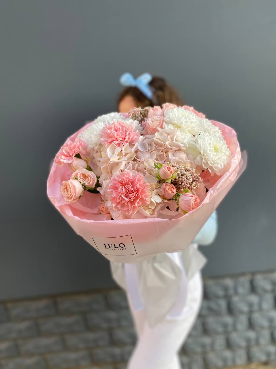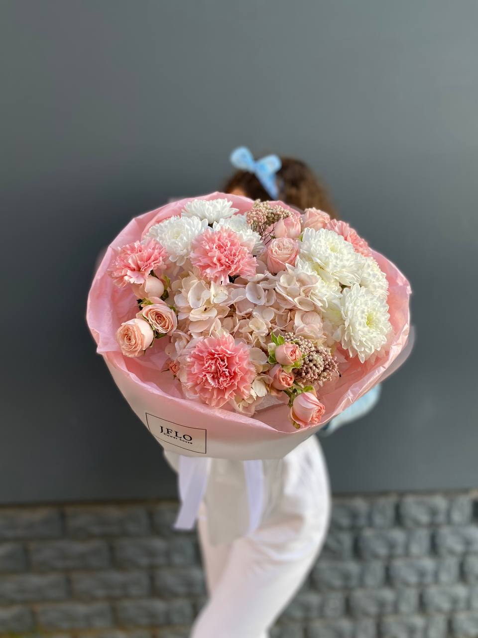 Герберы и гортензия создают воздушную композицию с лёгким ритмом и плавными переходами. Бомбамстик добавляет графики, а диантус смягчает общую форму.